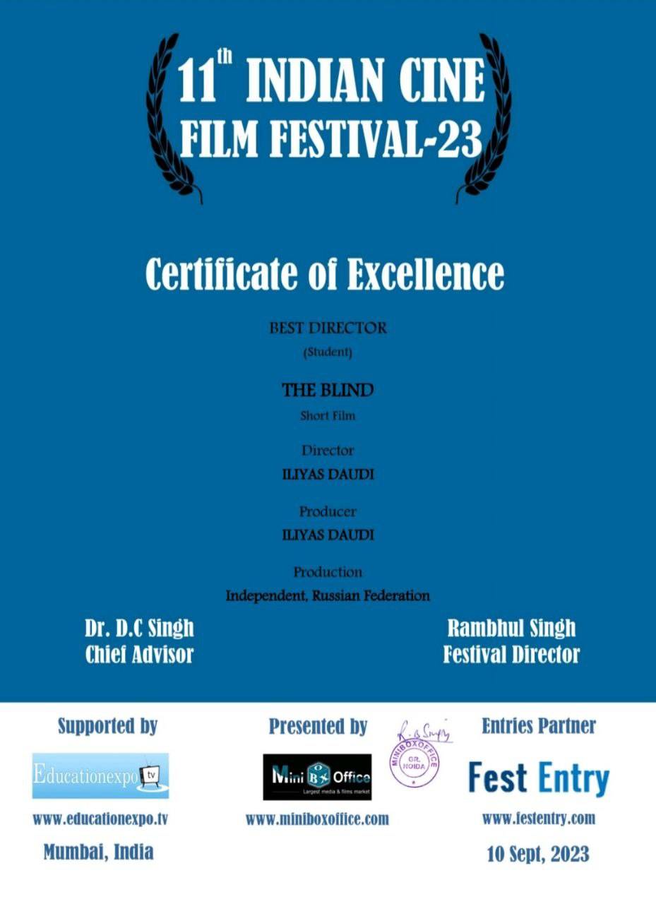 10 сентября в Мумбаи были подведены итоги 11-ого международного кинофестиваля «ICFF 2023». Герой России Ильяс Дауди с фильмом «Слепой» победил в номинации лучший режиссёр-постановщик (студент).