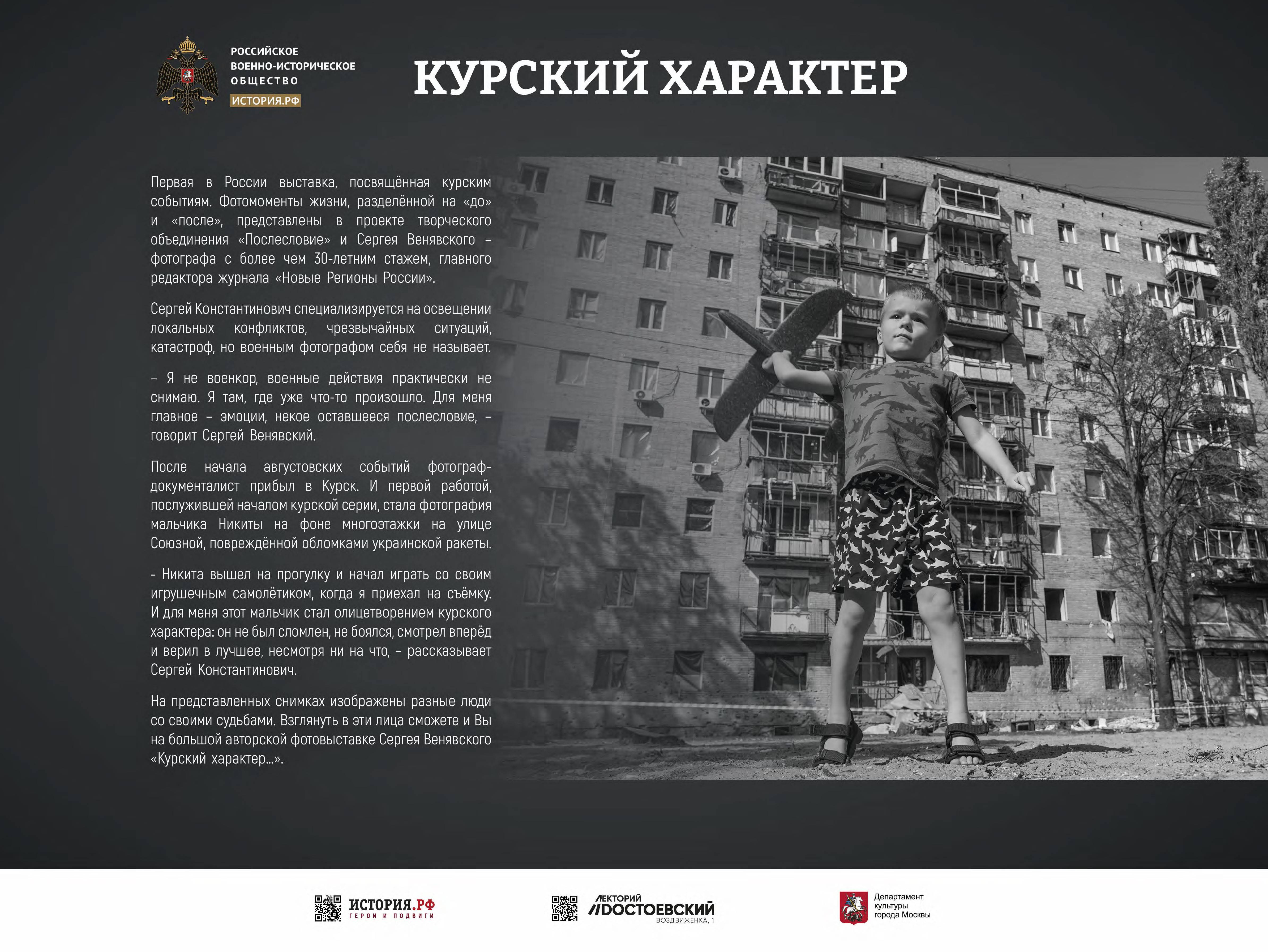 - Эта выставка для Российского военно-исторического общества особенная. И название у нее правильное. Фотовыставка о характере, о людях, о судьбах. Как они сейчас переживают трудные дни своей жизни. Первое, что бросается в глаза на выставке – мальчик, который играет с самолетом. Обратите внимание, что даже в самые тяжелые августовские дни поток людей в музей «Юные Защитники Родины» в Курске не прекращался. Люди приходят. Наверное, в этом они черпают какое-то свое отдельное вдохновение, отдельное желание следовать примерам юных героев, которые и в тылу, и на фронте во время Великой Отечественной войны защищали Отечество, - сказал заместитель начальника Управления Президента РФ по государственной политике в гуманитарной сфере, заместитель Председателя РВИО Николай Овсиенко.