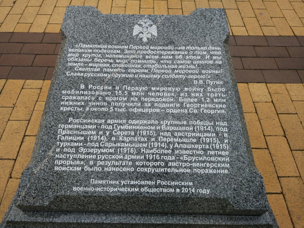 - Памятник воинам Первой мировой – не только дань великим подвигам. Это предостережение о том, что мир хрупок, напоминание всем нам об этом. И мы обязаны беречь мир, помнить, что самое ценное на земле – мирная, спокойная, стабильная жизнь! Светлая память героям Первой мировой войны! Слава русскому оружию и нашему солдату-герою! - сказал Владимир Путин в год 100-летия начала Первой мировой.