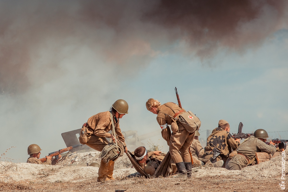 Вечером гостей ожидала реконструкция эпизода сражения времен Великой Отечественной войны, которую посвятили обороне Севастополя. Реконструкторы воссоздали события июня 1942 года. В последние дни обороны города немецко-румынские войска хотели занять рубежи советских войск в районе Федюхиных высот. При поддержке авиации и техники вражеские войска пытались в лоб взять позиции морской пехоты и красной армии. Защитники Севастополя оказали яростное сопротивление. По немецкой авиации открыла огонь советская 37-мм зенитка, в расчете которой находились девушки-бойцы. Войска неприятеля разбили отступающую советскую колонну автотехники вместе с зениткой. Находящиеся в колонне солдаты были либо убиты, либо взяты в плен. После первой легкой победы немецкие захватчики ринулись во вторую атаку, но получили жесточайший отпор защитников. Советские солдаты отстреливались из артиллерии и всех видов стрелкового оружия, включая станковые пулеметы «Максим». Немцы, понеся потери, остановили наступление и вызвали огонь своей артиллерии на позиции советских войск. Неприятель вновь попытался взять укрепления советской армии, но получили отпор. Тогда немецко-румынские солдаты пошли на хитрость и выставили вперед своей колонны советских пленных бойцов, девушек и раненых, толкали их перед собой на позиции защитников Севастополя.