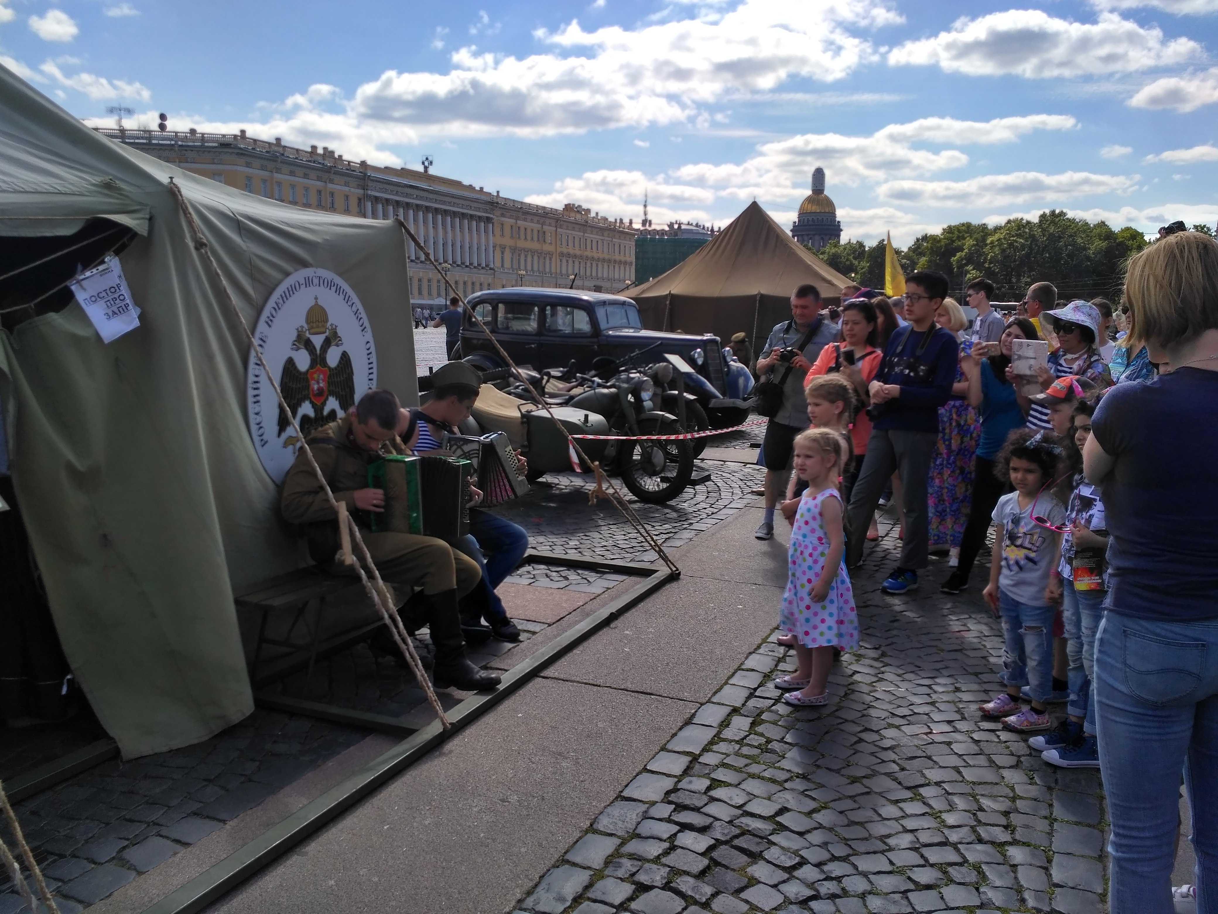 Завершением праздника – Дня окончания Битвы за Ленинград – стал автомотопробег. 7 автомобилей и мотоцикл проехали три круга по Дворцовой площади под аплодисменты гостей экспозиции.