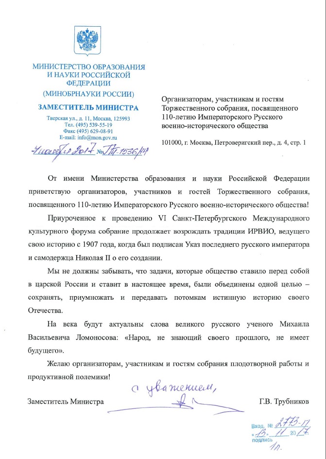 В адрес Российского военно-исторического общества поступило приветствие Заместителя Министра образования и науки РФ Григория Трубникова.