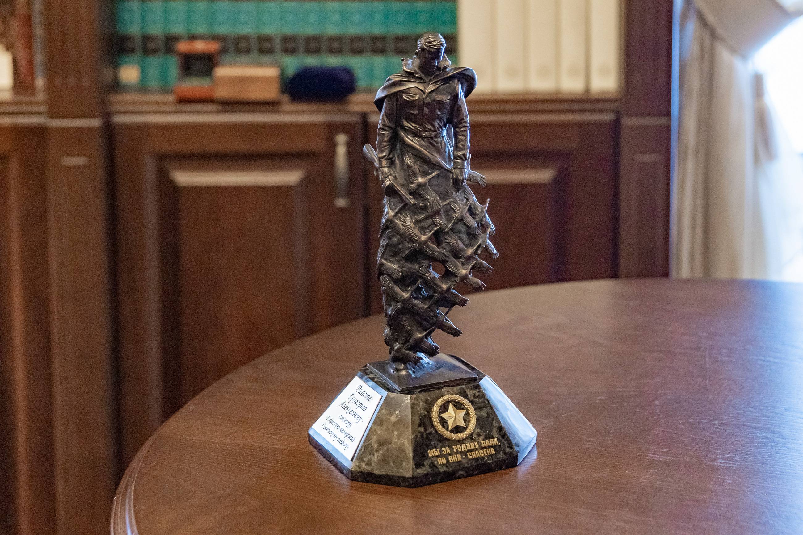 Заместитель начальника Управления Президента Российской Федерации по общественным проектам, заместитель Председателя РВИО Николай Овсиенко в знак благодарности за большой личный вклад Григория Рапоты в создание Ржевского мемориала Советскому солдату вручил Григорию Алексеевичу уменьшенную копию мемориала.