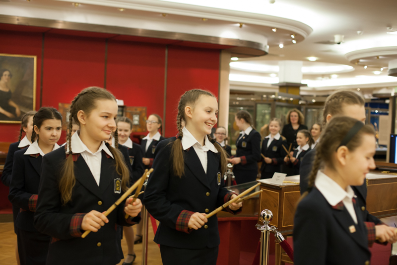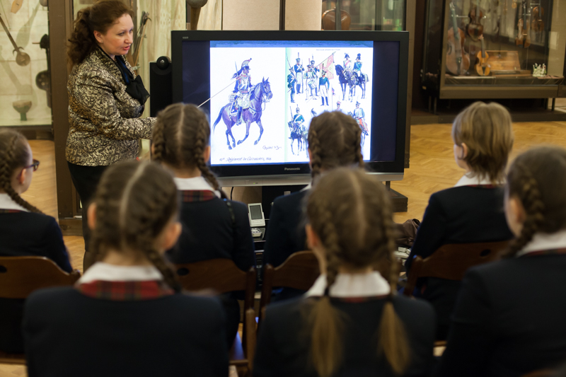 Первыми участниками музейного занятия стали ученицы 5-го класса Пансиона воспитанниц Министерства обороны Российской Федерации. Они увидели духовые наградные музыкальные инструменты начала 19 века и услышали их звучание. Научный сотрудник музея Ирина Новичкова напомнила кадетам о славных страницах российской истории, рассказала о доблести русских воинов, защищавших Отчизну. В конце занятия кадеты продемонстрировали умение ходить парадным строем, промаршировав по залам основной экспозиции и сопровождая шаг аккомпанементом на ударных инструментах. Сотрудники Музейного объединения поздравили юных учениц Пансиона с Днем защитника Отечества и вручили им памятные подарки, предоставленные Российским военно-историческим обществом.