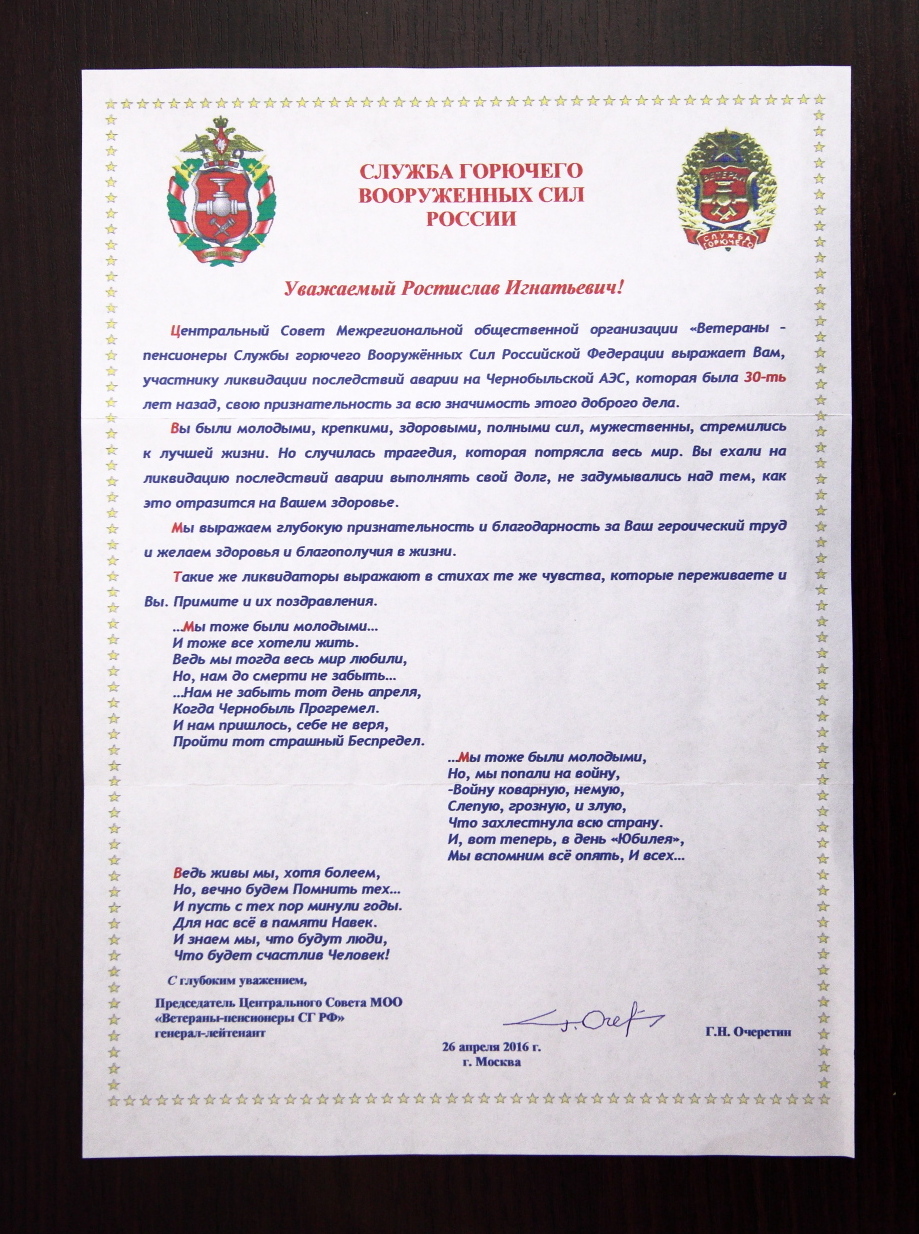 - Уважаемый Ростислав Игнатьевич! Центральный Совет Межрегиональной общественной организации «Ветераны-пенсионеры Службы горючего Вооруженных сил Российской Федерации» выражает Вам, участнику ликвидации последствий аварии на Чернобыльской АЭС, которая была 30 лет назад, свою признательность за всю значимость этого доброго дела. Вы были молодыми, крепкими, здоровыми, полными сил, мужественны, стремились к лучшей жизни. Но случилась трагедия, которая потрясла мир. Вы ехали на ликвидацию последствий аварии выполнять свой долг, не задумываясь над тем, как это отразится на Вашем здоровье. Мы выражаем глубокую признательность и благодарность за Ваш героический труд и желаем здоровья и благополучия в жизни! – говорится в письме.