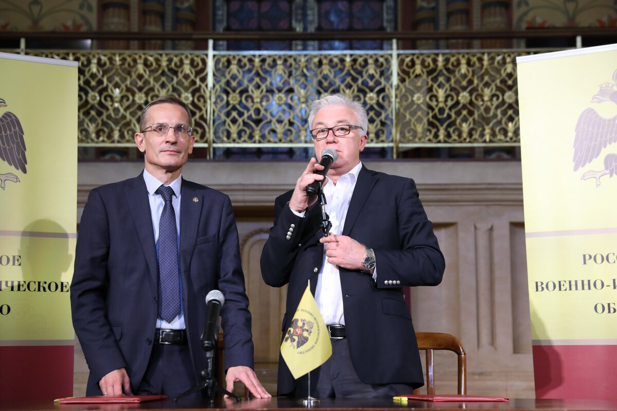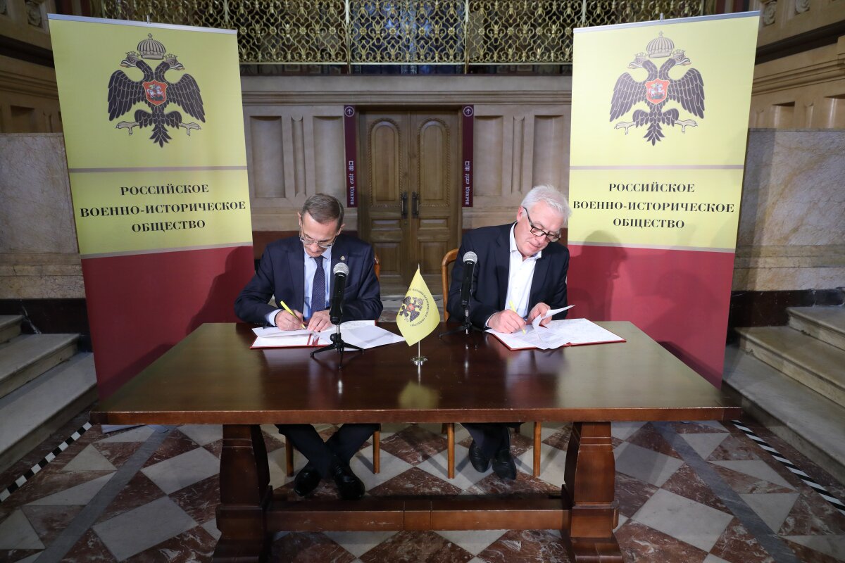 Церемония началась с подписания Соглашения о сотрудничестве между Российским военно-историческим обществом и Государственным историческим музеем. В ней приняли участие научный директор Российского военно-исторического общества Михаил Мягков и директор Государственного исторического музея Алексей Левыкин.