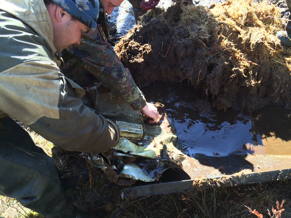 Экспедиция проходила в условиях повышенной сложности: болотистая местность, глубина воронки, в которой были обнаружены фрагменты-более двух метров. Детали самолета, среди которых: бортовое вооружение-пулеметы ШКАС и УБТ, детали кабины, двигателя, компас штурмана и множество мелких фрагментов - поднимали с помощью специального оборудования-манипулятора.