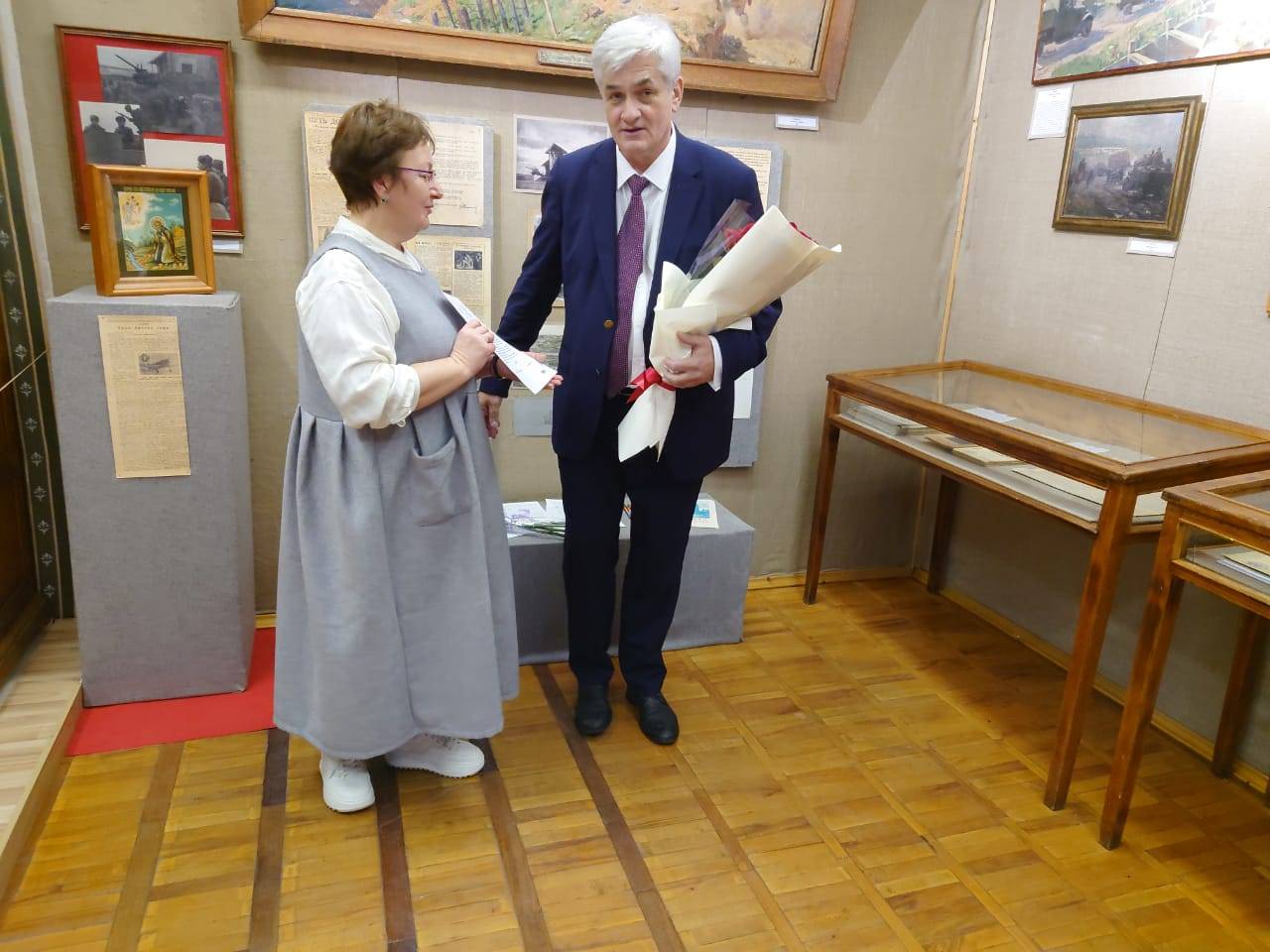 Приветственный адрес Директору музея Натальи Чулановой вручил Исполнительный директор Регионального отделения РВИО в Ленинградской области Владимир Казаков. Также он передал поздравления и самые добрые пожелания от имени Председателя Регионального отделения РВИО в Ленинградской области, директора Музея «Битва за Ленинград» им. З.Г. Колобанова Олега Титберия.