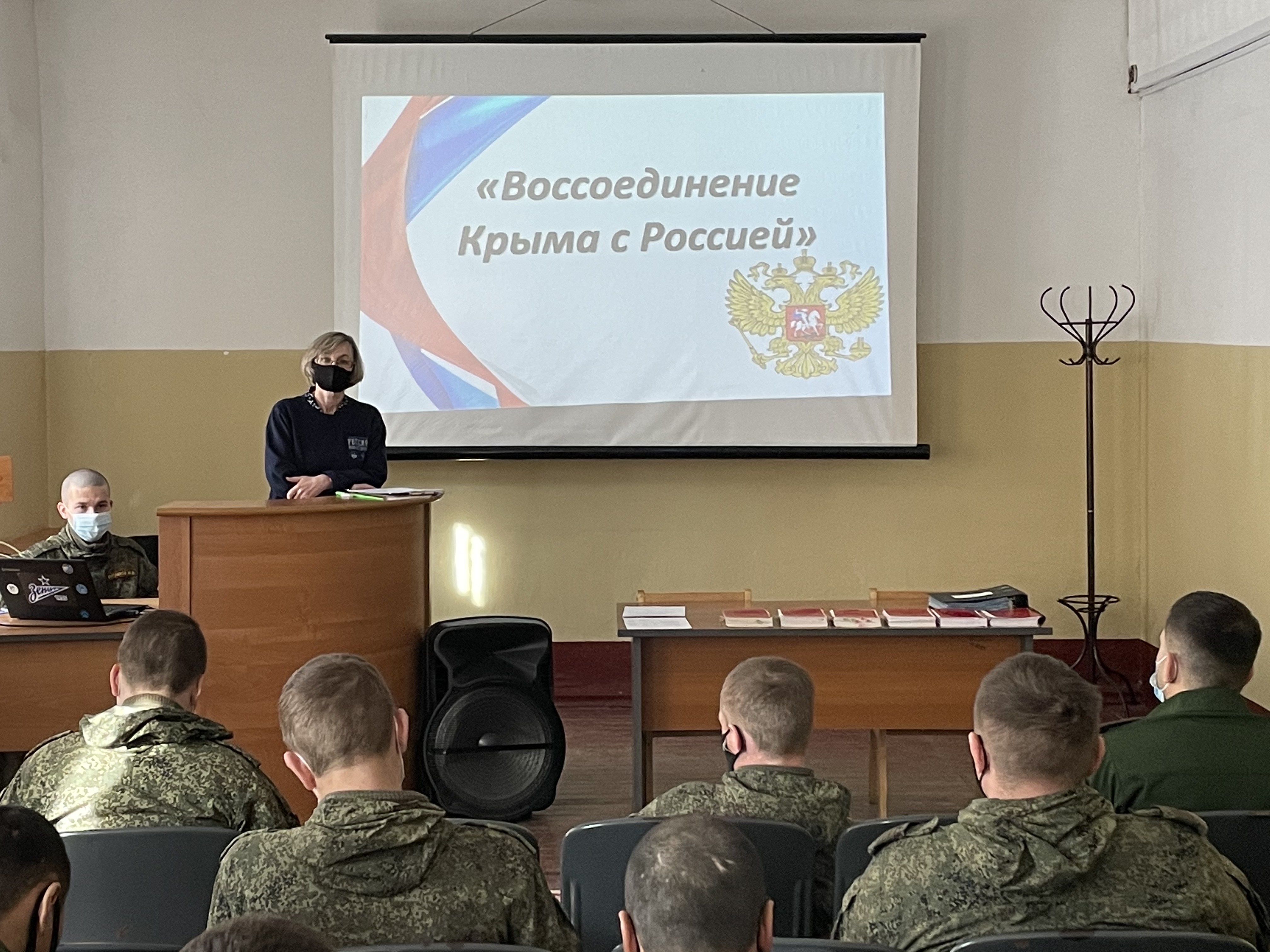 На Сахалине при содействии Сахалинского отделения РВИО для военнослужащих по призыву в отдельном батальоне управления Армейского корпуса Восточного военного округа была организована тематическая лекция. Сотрудник Музейно-мемориального комплекса «Победа» Ольга Столбина рассказала молодым воинам об историческом пути Крыма от древности до современного времени.