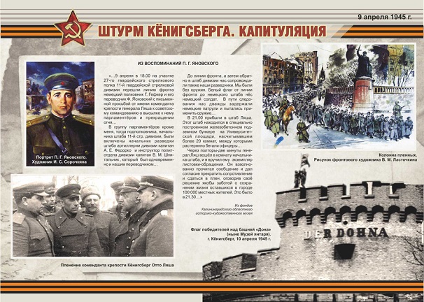 Одновременно в двухстах школах, детских садах, домах культуры, библиотеках области и даже на кораблях Балтийского флота была представлена выставка «Восточно-Прусская операция», подготовленная сотрудниками Калининградского областного историко-художественного музея.