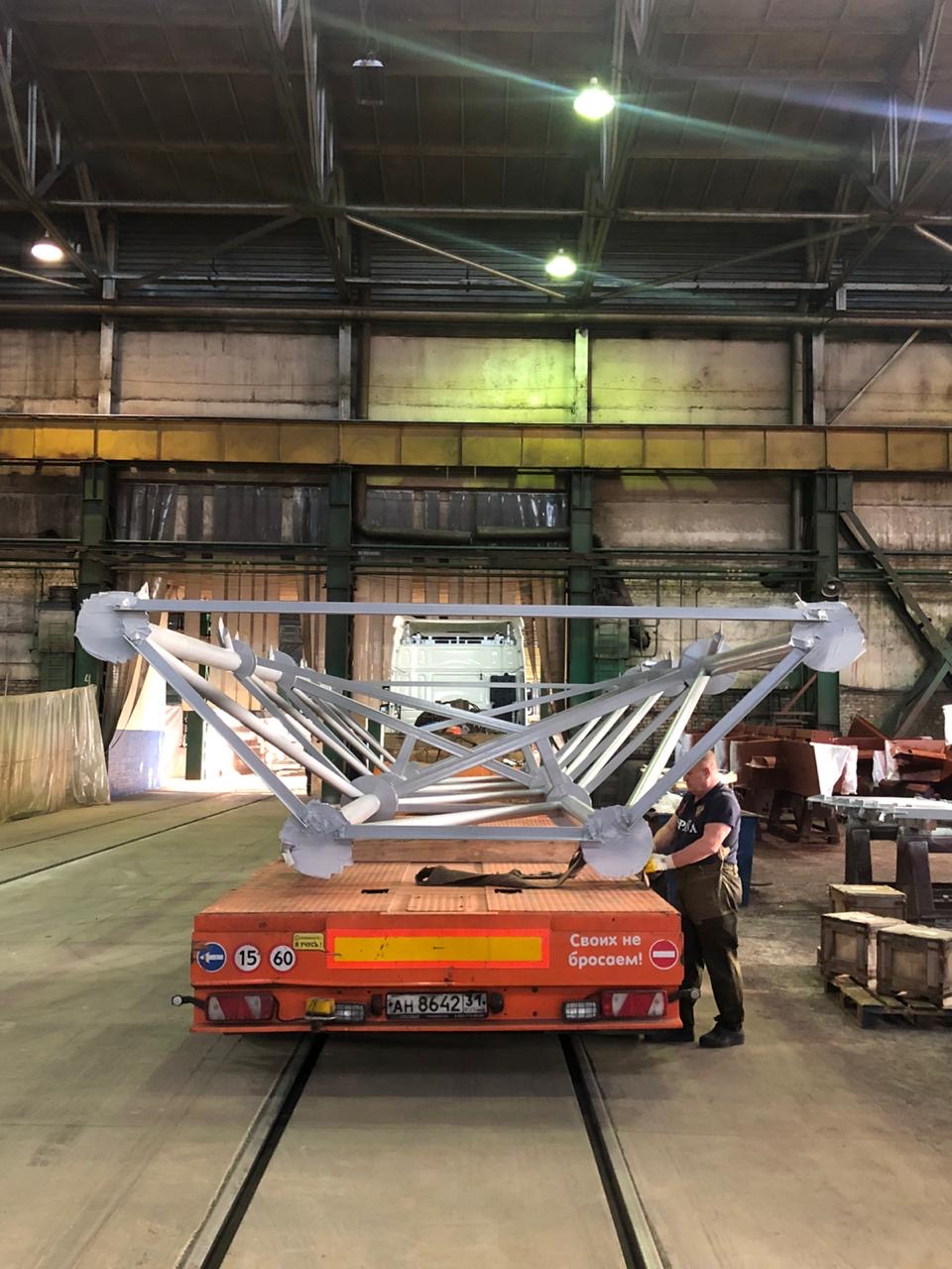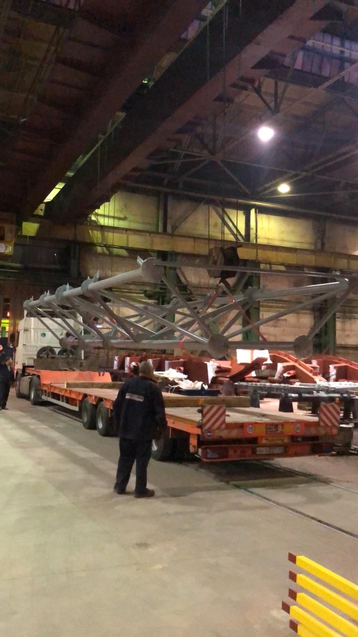 Для перевозки с места изготовления к месту монтажа инженеры разделили конструкцию на три части. Первый ярус перемещался на двух тралах с машинами сопровождения, поскольку груз по ширине занимал почти две полосы движения. Из-за негабаритных параметров основания будущего монумента пришлось разобрать проходную завода. Второй ярус поместился в один грузовик.