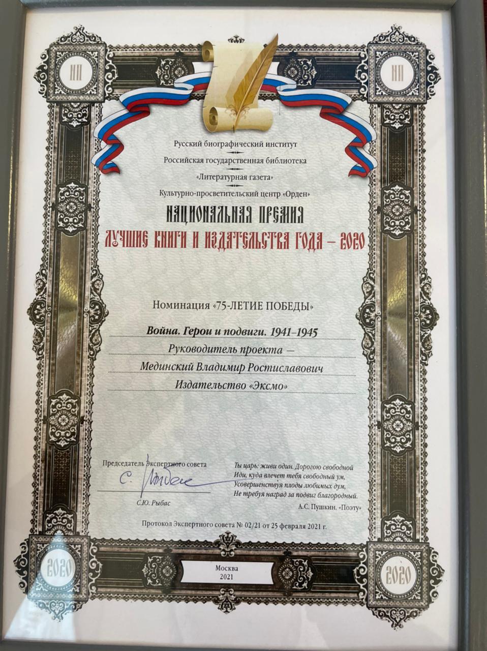 Проект Владимира Мединского «Война. Герои и подвиги» стал лауреатом национальной премии «Лучшие книги и издательства года-2020» в номинации «75-летие Победы».