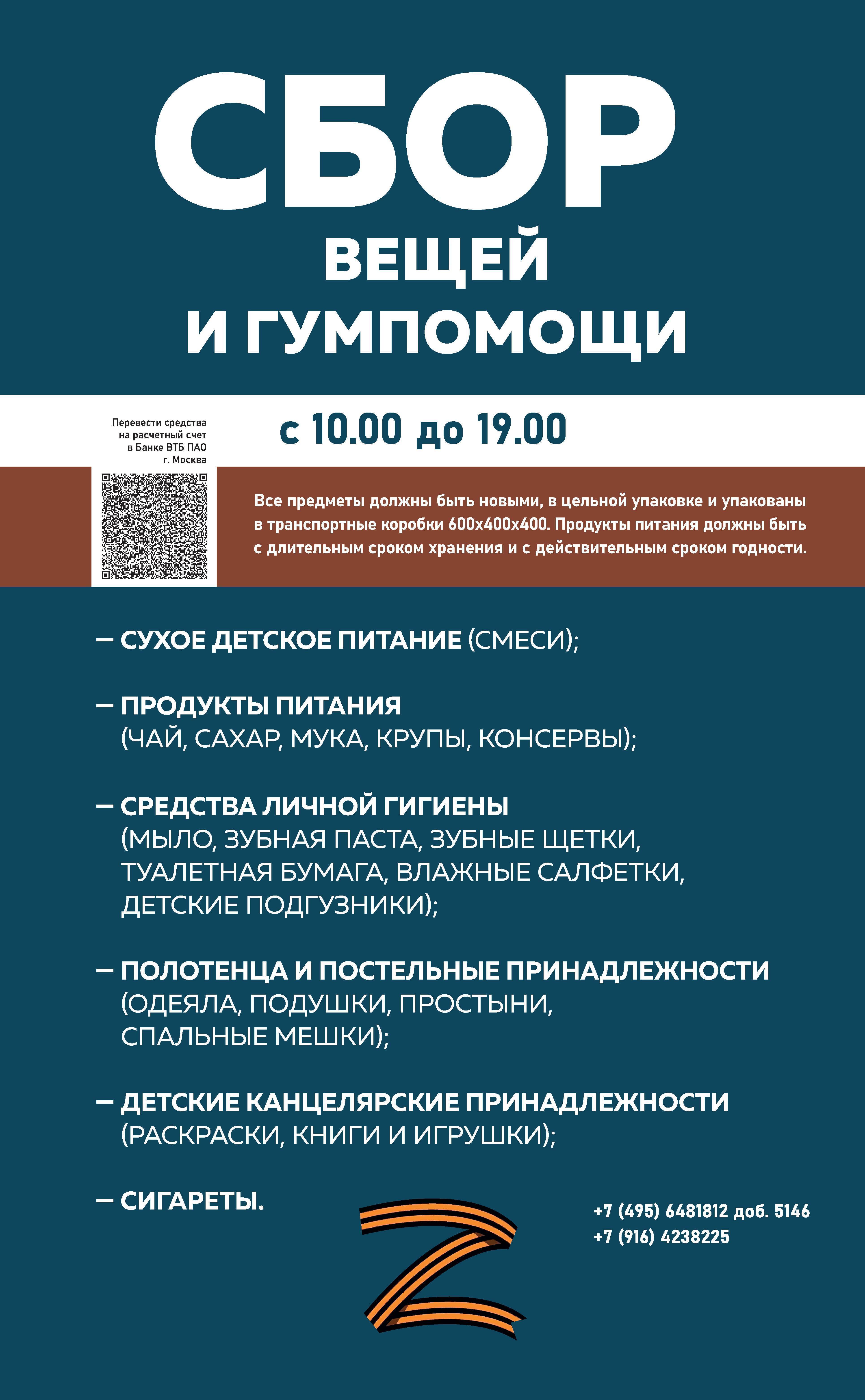 Всем желающим помочь мирным жителям и поддержать наших военных напоминаем, что сбор помощи осуществляется на территории Музея военной формы по адресу: ул. Большая Никитская, дом 46/17 стр.1.