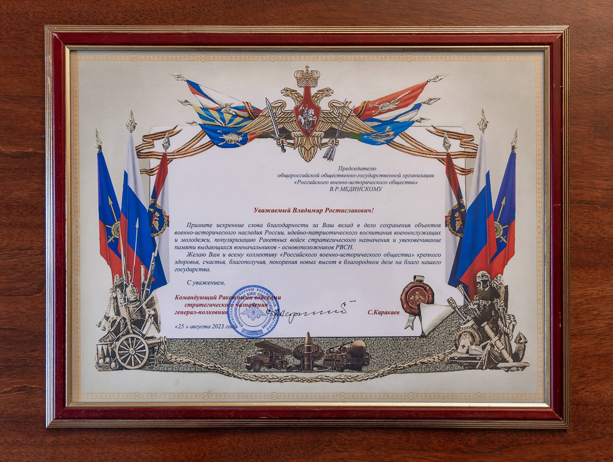 - Примите искренние слова благодарности за Ваш вклад в дело сохранения объектов военно-исторического наследия России, идейно-патриотического воспитания военнослужащих и молодёжи, популяризацию Ракетных войск стратегического назначения и увековечивание памяти выдающихся военачальников – основоположников РВСН.