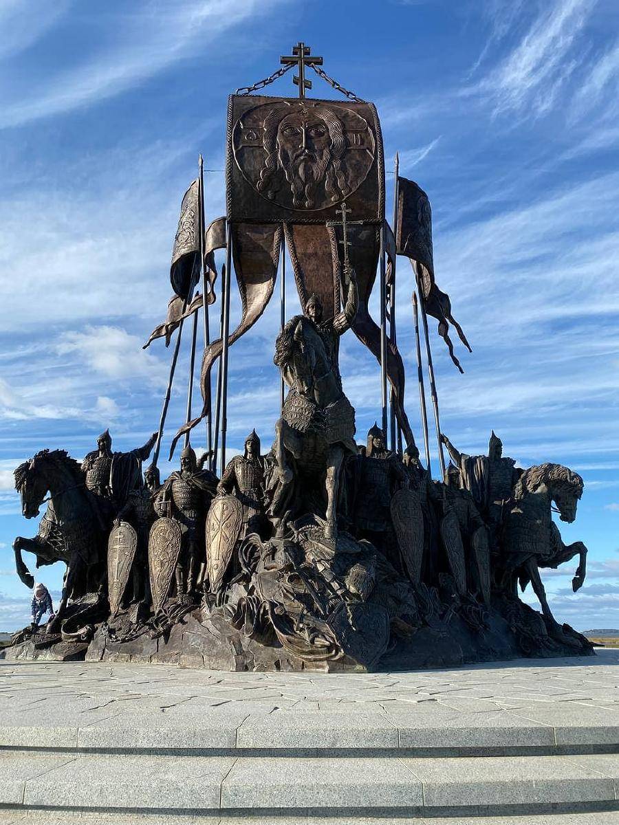 Победителем конкурса стал проект, представленный Митрополитом Тихоном (Шевкуновым), скульпторами Виталием Шановым и Дарьей Успенской, архитекторами Дмитрием Смирновым и Константином Фоминым. Комплекс представляет собой 15-метровую скульптурную композицию, состоящую из фигур святого благоверного князя Александра Невского, двух всадников и шести спешившихся воинов, а также флаговой группы. Скульптурная композиция расположена на шестиметровом кургане. Тыльная часть скульптурной композиции является символической часовней под открытым небом и состоит из мозаичного фриза, расположенного на полукруглой подпорной стене, напротив которой – поклонный крест.