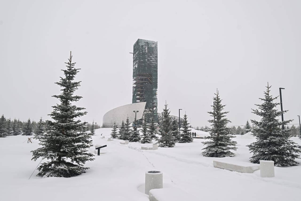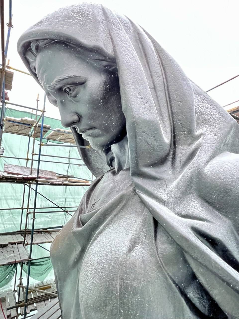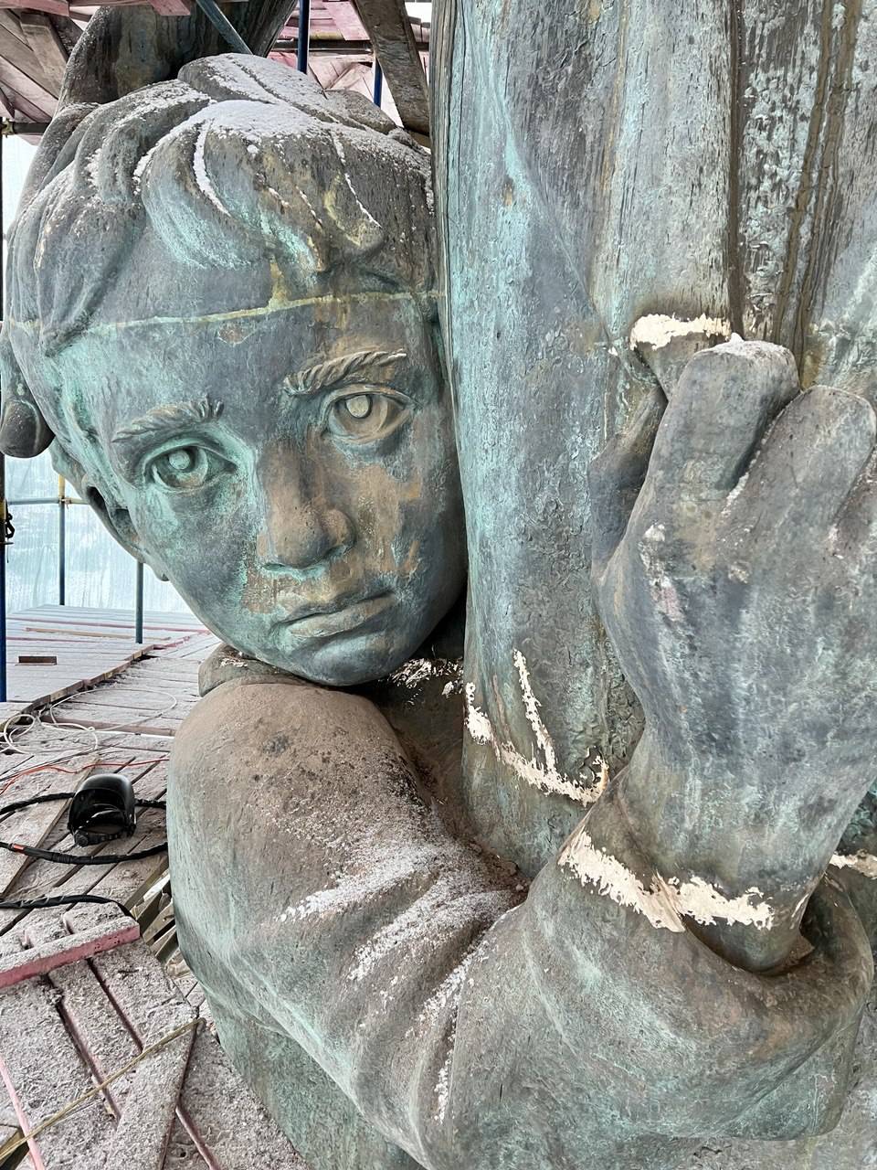 Сегодня скульпторы тонируют бронзу и латунь, убирают швы на стеле. В ближайшее время планируется демонтировать строительные леса.