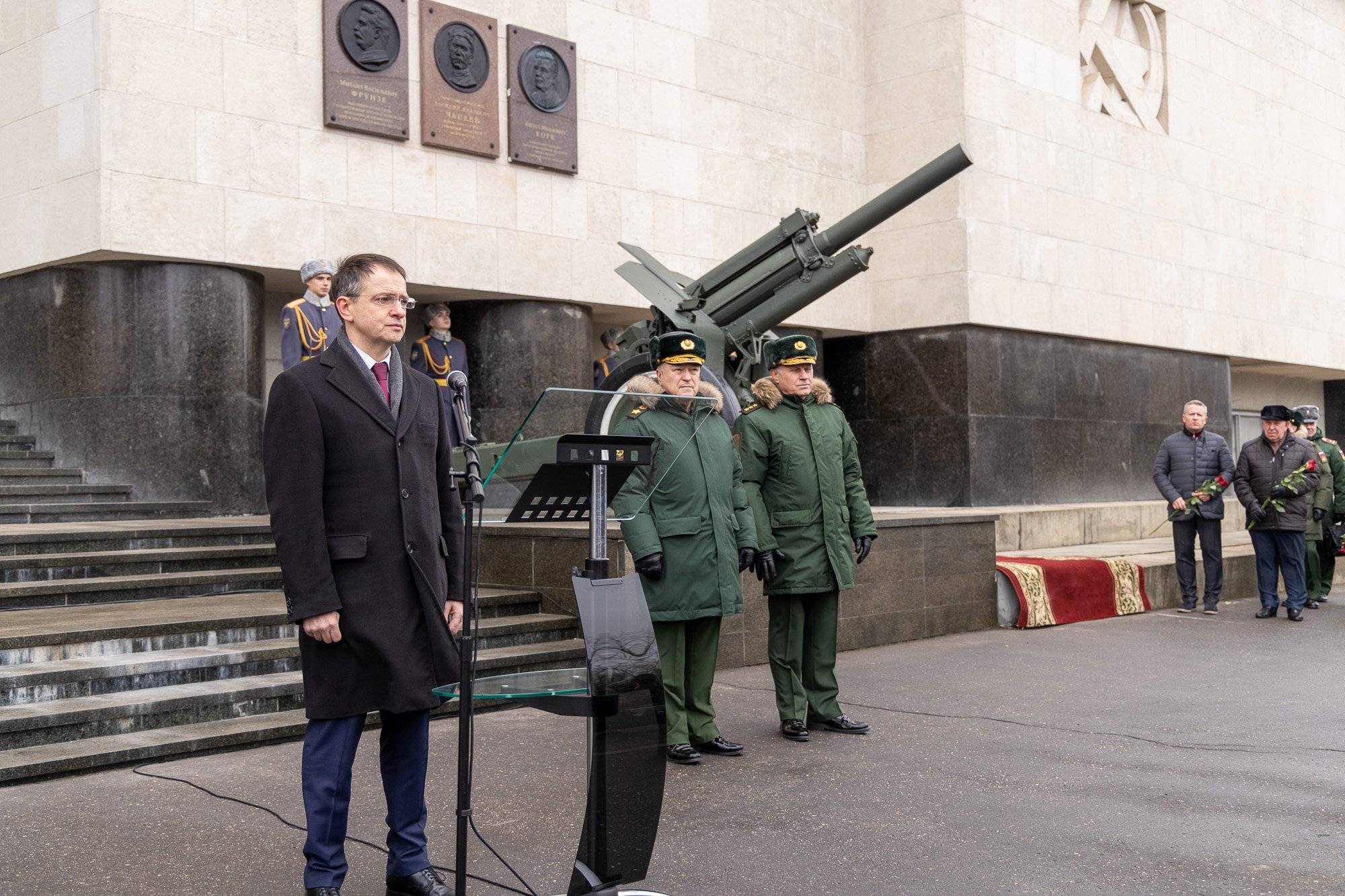 В церемонии приняли участие помощник Президента РФ, Председатель Российского военно-исторического общества Владимир Мединский и Статс-секретарь – заместитель Министра обороны РФ, генерал армии Николай Панков.