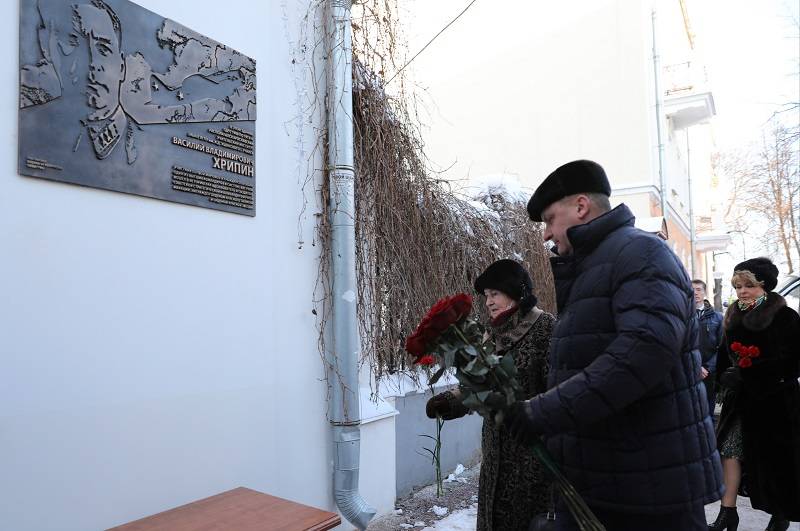 В Ярославле в День героев Отечества торжественно открыта мемориальная доска в память о советском военачальнике, комкоре Василии Хрипине. Ее установили на фасаде здания №2/23а в Советском переулке, принадлежащего ранее Ярославскому учительскому институту, где учился выдающийся деятель авиации.