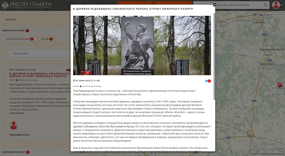 - Общенародный портал хорош тем, что любой гражданин нашей страны и даже из зарубежья сможет вносить на карту страны памятные места. Мы давно призываем чтобы активисты собирали информацию о памятниках и обелисках непосредственно в своем селе, в своем городе, и старались проводить эти обелиски в порядок. Однако уход за воинскими захоронениями, это для нас (для поисковиков) – половина дела. Мы заметили ряд моментов, когда после реконструкции исчезают имена бойцов и командиров Красной Армии. К примеру, в одной из деревень в Тосненском районе на мемориал было нанесено около 4 000 фамилий бойцов, а после реконструкции осталось чуть больше 2 000. Это недопустимо. Важно, чтобы все данные о защитниках родины были сохранены – подчеркнул Антон Торгашев.