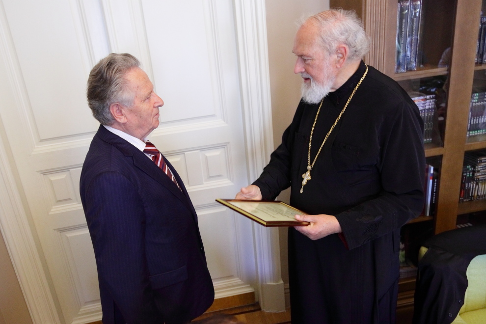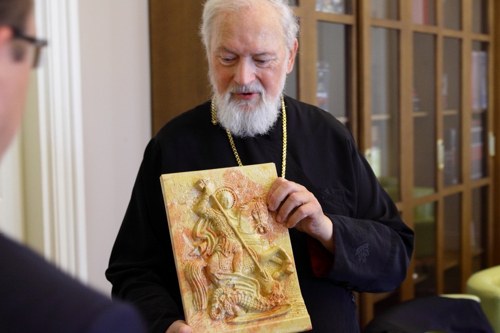 и инициативу возвращения в Россию из Австралии Андреевского флага линейного корабля «Император Александр Третий»протоиерею Михаилу Протопопову вручили Благодарность от Министра культуры Российской Федерации Владимира Мединского. Советник Председателя Российского военно-исторического общества Ростислав Мединский и Исполнительный директор Российского военно-исторического общества Владислав Кононов такжепередали Михаилу Протопопову уменьшенную копию памятника «Полковомусвященнику Василию Васильковскому», которой был установлен РВИО в городе воинской славы Малоярославце Калужской области. Памятные медали «20 лет Союзу казаков воинов России» Павел Платов вручил Ростиславу Мединскому и Михаилу Протопопову,который в свою очередь передал в дар РВИО икону Святого Георгия Победоносца.