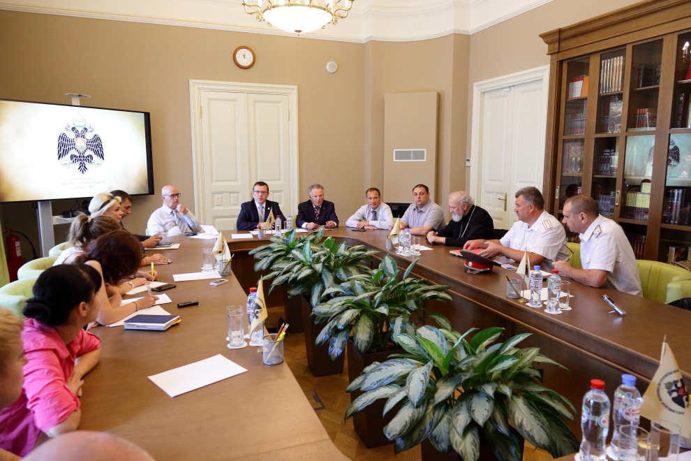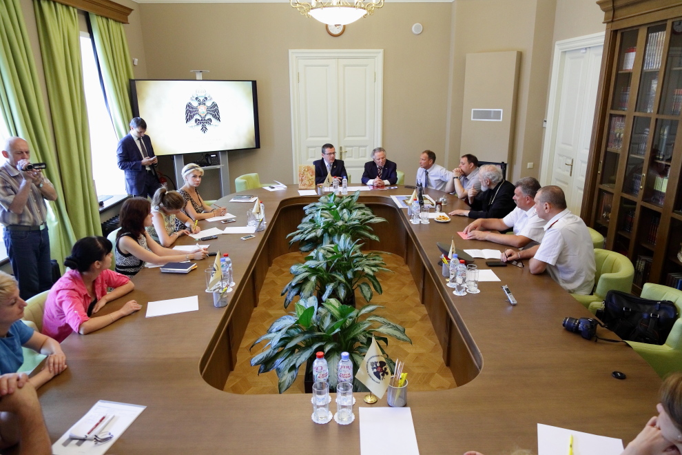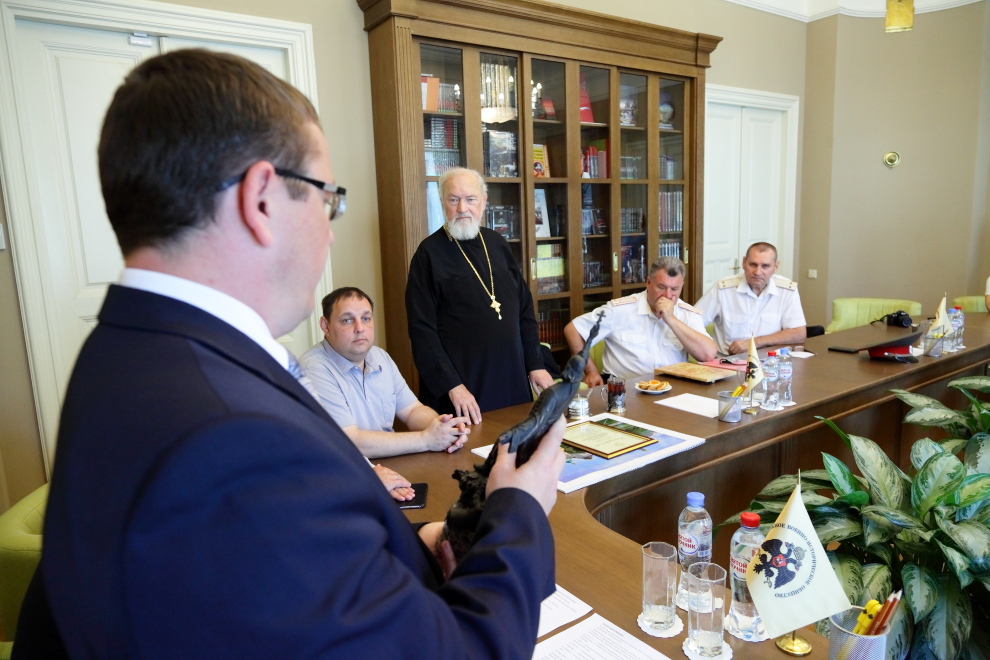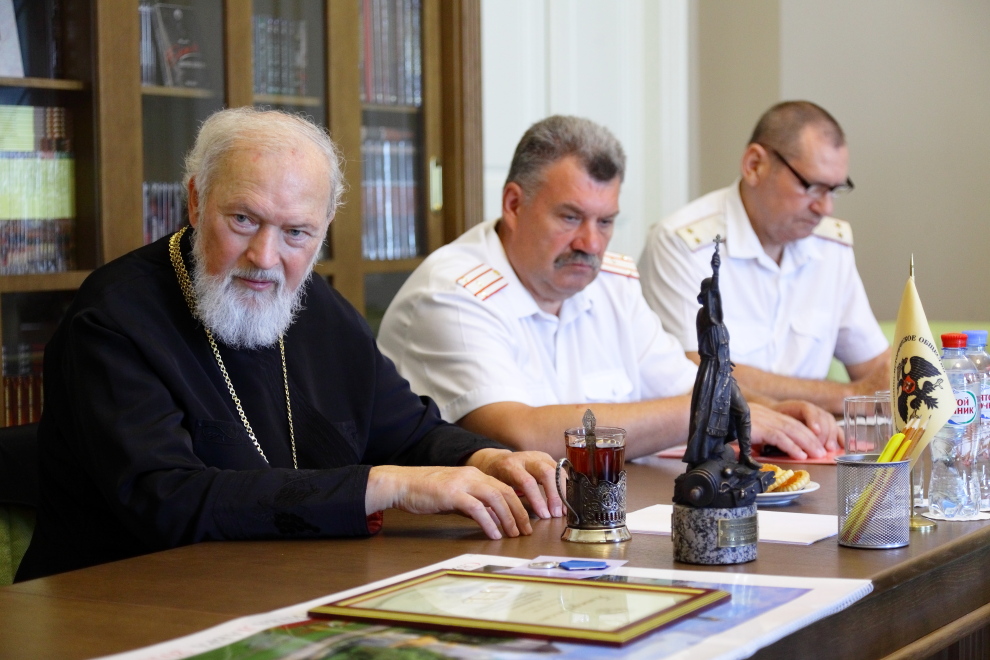 Сегодня Российское военно-историческое общество посетила делегация почетных гостей: Митрофорный протоиерей Михаил Протопопов (Австралийско-Новозеландская епархия Русской Православной Церкви за границей); казачий генерал, заместитель Верховного атамана Союза казаков воинов России и зарубежья Павел Платов, Руководитель Казачьего Информационного Центра России Алексей Зборовский, Уполномоченный РВИО по делам казачества в США Валерий Анненко. С принимающей стороны на встрече присутствовали: Советник Председателя Российского военно-исторического общества Ростислав Мединский, Исполнительный директор Российского военно-исторического общества Владислав Кононов.