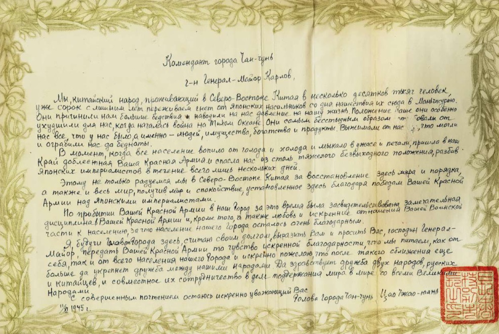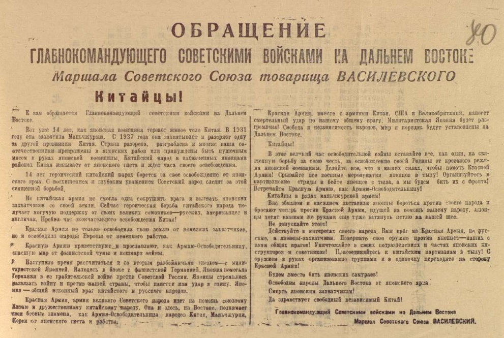 В ходе пресс-конференции заместитель начальника Центрального архива Министерства обороны Российской Федерации Владислав Лоншаков передал Российскому военно-историческому обществу ряд документов, ранее не известных широкой общественности: о Маньчжурской стратегической наступательной операции, о приказах советского командования, а также о встрече китайским населением советских войск и другие документы, подтверждающие, что Красная Армия пришла в Китай как освободители от жестокой японской оккупации. Один из документов посвящен благодарности главы города Чань-Чунь советским войскам.