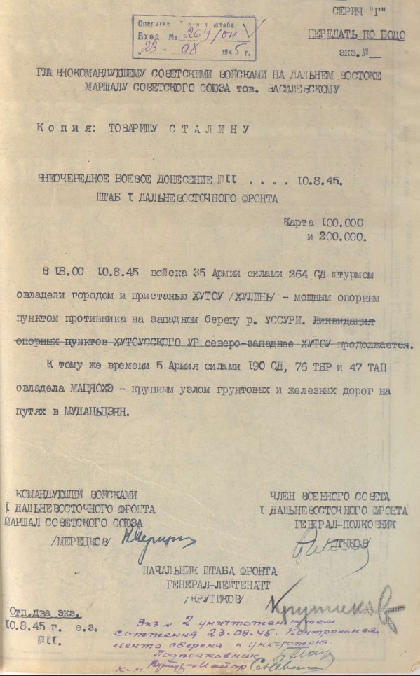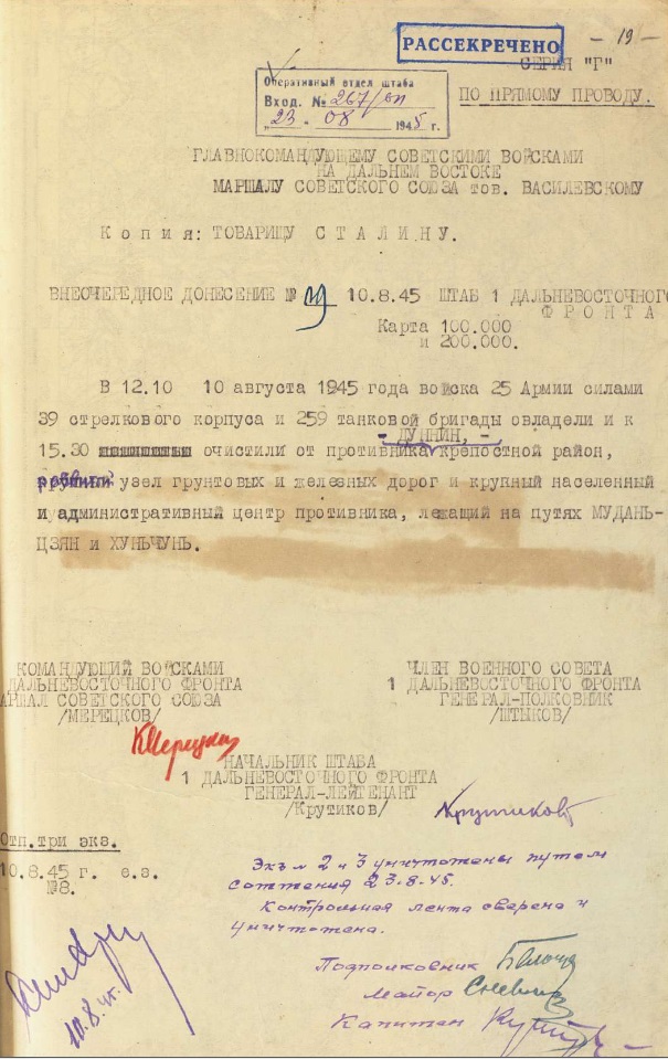 Ведущие историки и архивисты Российской Федерации рассказали о вкладе Красной Армии в окончание Второй мировой войны. В ходе круглого стола в пресс-центре МИА «Россия Сегодня» были представлены и переданы в РВИО ранее не известные широкой общественности документы из Центрального архива Министерства обороны Российской Федерации. В них отражается ход боевых действий во время Маньчжурской стратегической наступательной операции в 1945 году. Документы опубликованы на сайте История.рф.