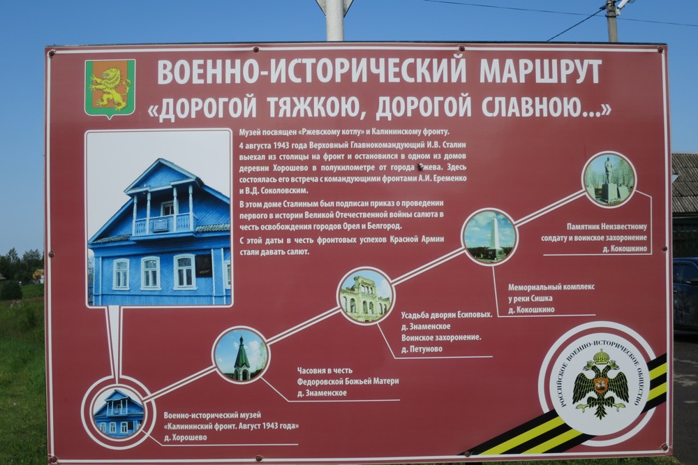 Небольшой дом в пос. Хорошево под Ржевом (Тверская область) хранит память о важных событиях. Здесь в ночь с 4 на 5 августа 1943 года останавливался Верховный главнокомандующий Иосиф Сталин. Здесь же прошла его встреча с командующими фронтами Андреем Еременко и Василием Соколовским, а наутро - подписание приказа о проведении в Москве первого салюта в честь войск, освободивших Орел и Белгород. Ровно два года назад Российским военно-историческим обществом в этом доме был открыт музей «Калининский фронт. Август 1943 года». После долгих лет забвения сюда потянулась народная тропа.