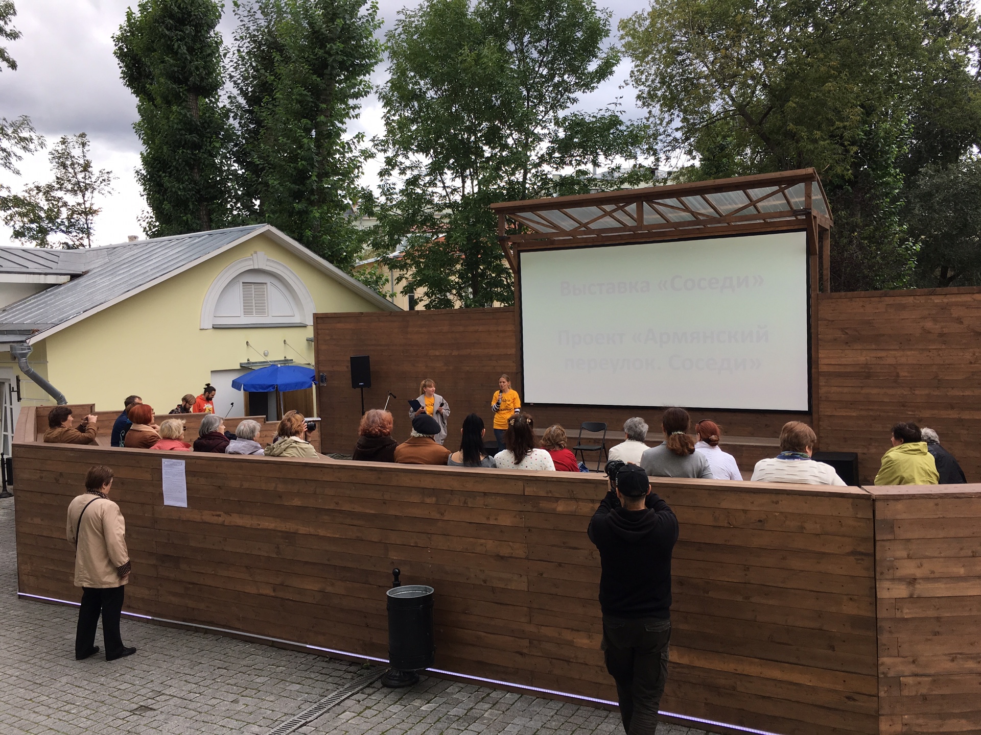 Торжественная часть празднования началась с презентации уличной выставки-акции «Соседи», организованной музеем «Огни Москвы»,в которой приняли участие Глава Управы района «Басманный» Дадаев Салман Кадиявович, сотрудники музея «Огни Москвы», Музея военной формы одежды и почетные жители района.