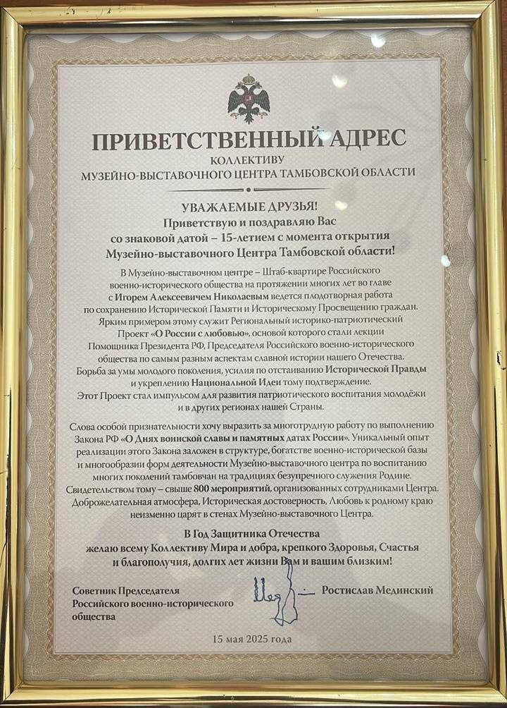 Слова особой признательности хочу выразить за многотрудную работу по выполнению Закона РФ «О Днях воинской славы и памятных датах России». Уникальный опыт реализации этого Закона заложен в структуре, богатстве военно-исторической базы и многообразии форм деятельности Музейно-выставочного центра по воспитанию многих поколений тамбовчан на традициях безупречного служения Родине. Свидетельством тому – около 800 мероприятий, организованных сотрудниками Центра. Доброжелательная атмосфера, Историческая достоверность, Любовь к родному краю неизменно царят в стенах Музейно-выставочного Центра.