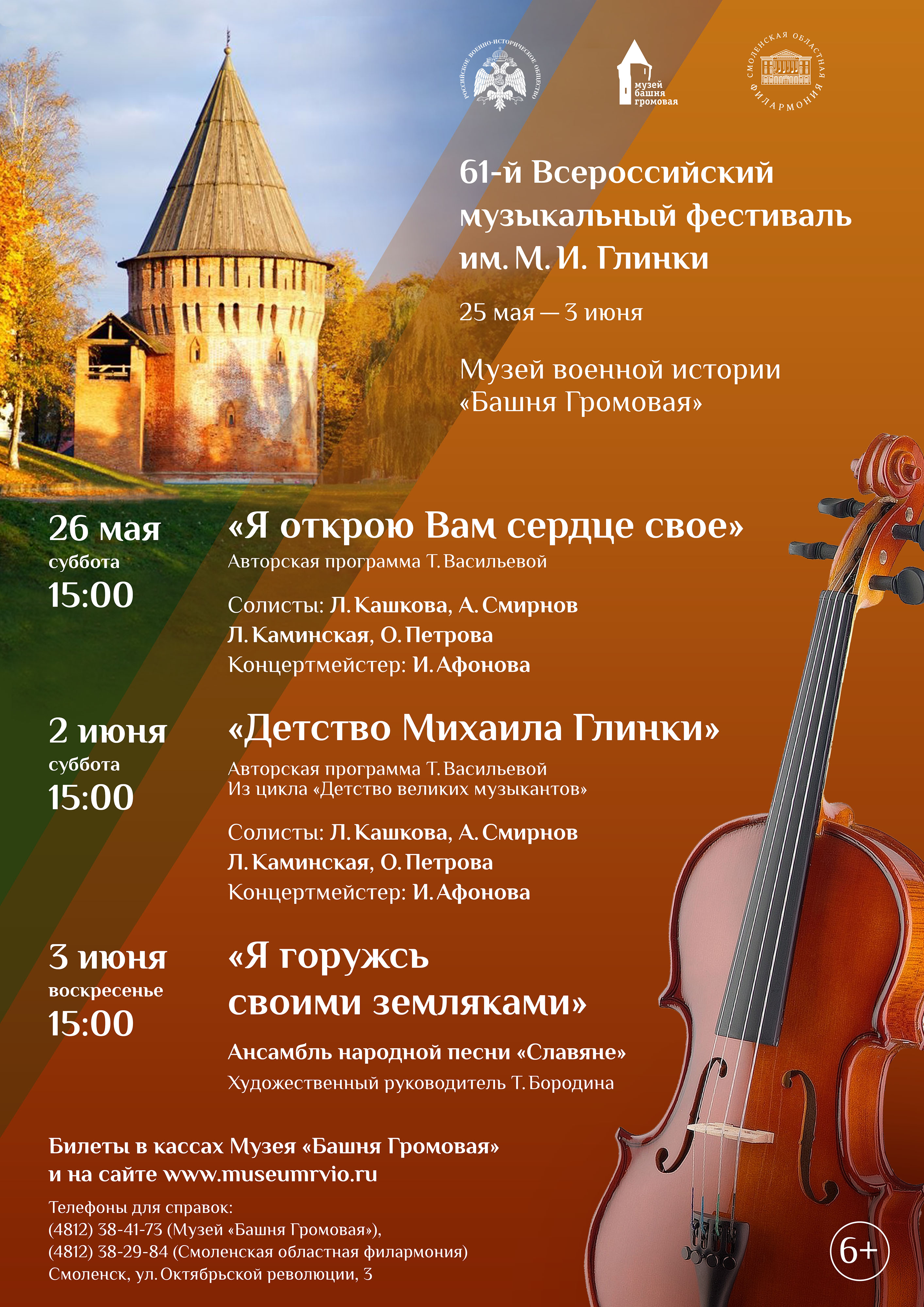 Еще одним важным событием лета станет 61-й Всероссийский музыкальный фестиваль им. М. И. Глинки, который пройдет в Музее военной истории «Башня Громовая» с 26 мая по 3 июня. Зрителей ждут авторские программы «Я открою Вам сердце свое» и «Детство Михаила Глинки», а также «Я горжусь своими земляками» в исполнении ансамбля народной песни «Славяне».