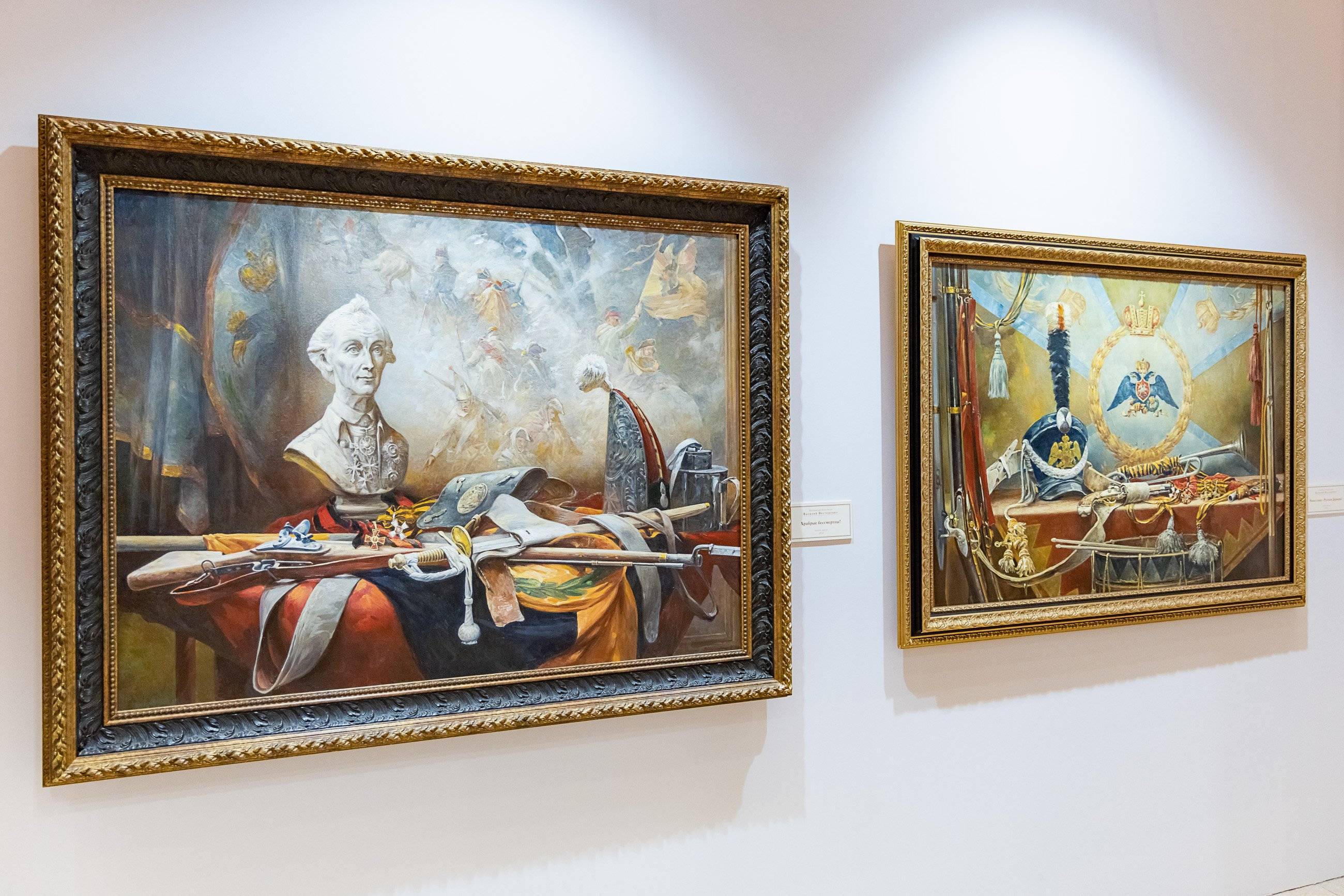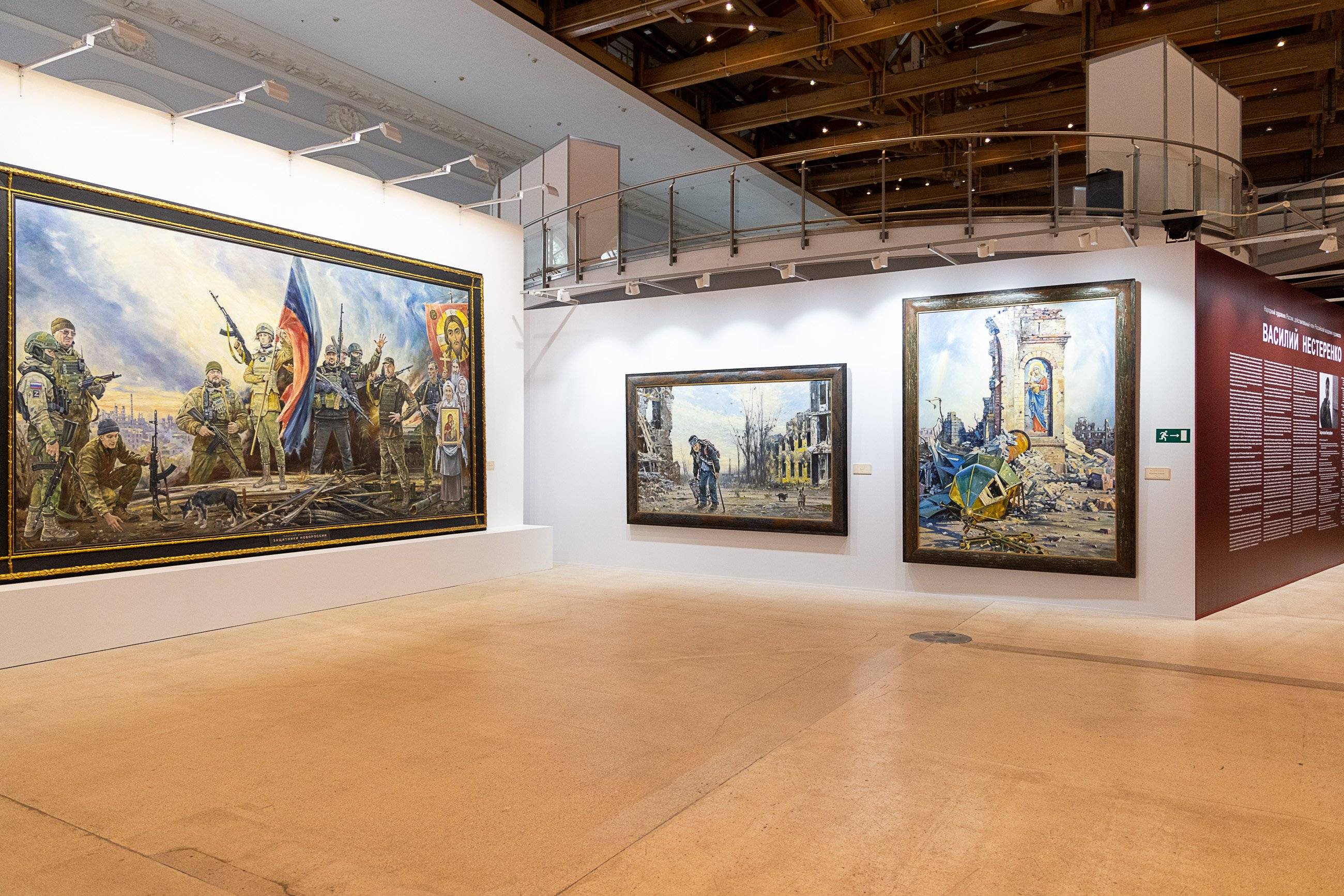 В центре экспозиции Василия Нестеренко – работы, перебрасывающие мостик от истории России к современности и иллюстрирующие события дня сегодняшнего. Это триптих «Сирийская земля», «Письмо недругам России», виды городов Новороссии и многофигурное полотно, изображающее ее защитников.