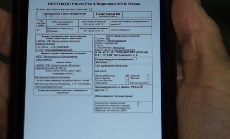 Если кто-то думает, что поисковая работа - это только обнаружение и подъем останков, - то он очень ошибается. Деятельность отрядов строго регламентирована: на каждый раскоп и эксгумацию заполняются протоколы по особой форме, к ним нужно приложить фотографии и координаты. Работа бумажная, но необходимая: четыре листа формата А4 содержат всю важную информацию. В прошлом году Вологодское объединение поисковиков выиграло президентский грант и разработало специальное приложение для мобильных устройств. Оно позволяет сократить время на заполнение форм, сделать этот процесс проще и удобнее.
