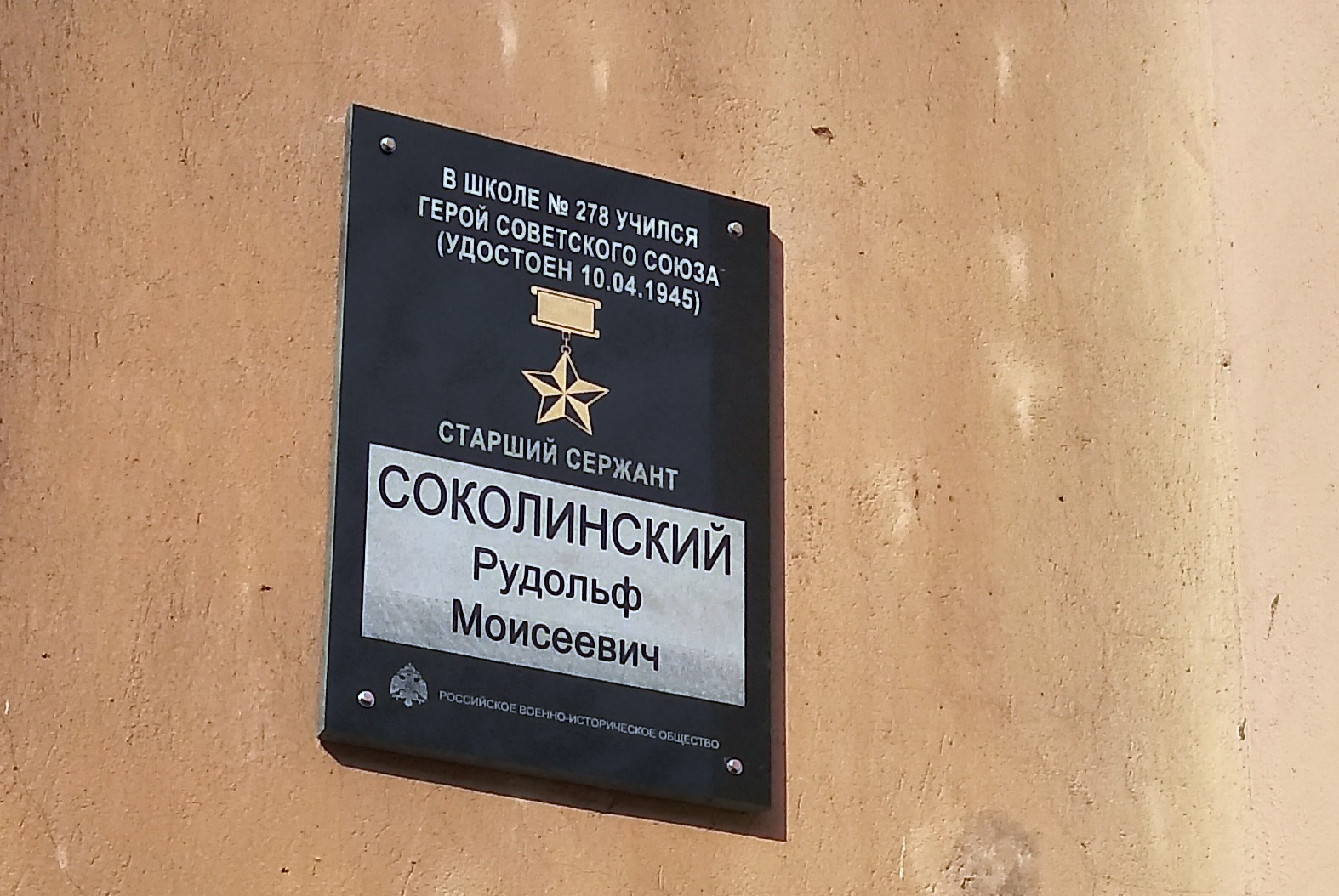 На здании гимназии №278 Санкт-Петербурга открыта доска старшему сержанту Рудольфу Соколинскому. Он находился в составе передового отряда, который 23 января 1945 года форсировал реку Одер по льду у населённого пункта Гросс-Шиммендорф. Старший сержант Соколинский участвовал в боях по закреплению захваченного плацдарма, отражая все попытки противника потеснить наши подразделения. Звание Героя Советского Союза ему присвоено 10 апреля 1945 года.