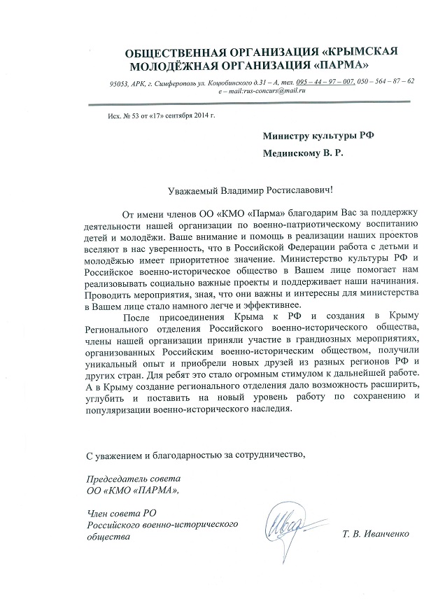 «После присоединения Крыма члены нашей организации приняли участие в мероприятиях, организованных Российским военно-историческим обществом, получили уникальный опыт и приобрели новых друзей из разных регионов России», - написали в благодарственном письме руководители Крымской молодёжной организации «Парма», созданной в 2009 году на базе детского отряда скаутов им. Долгорукова-Крымского и известной своим богатым опытом проведения этнографических и патриотический экспедиций и молодежных лагерей. – Для наших ребят это стало огромным стимулом к дальнейшей работе. Сотрудничество нашей организации с РВИО даст возможность поставить на новый уровень работу по сохранению и популяризации военно-исторического наследия».