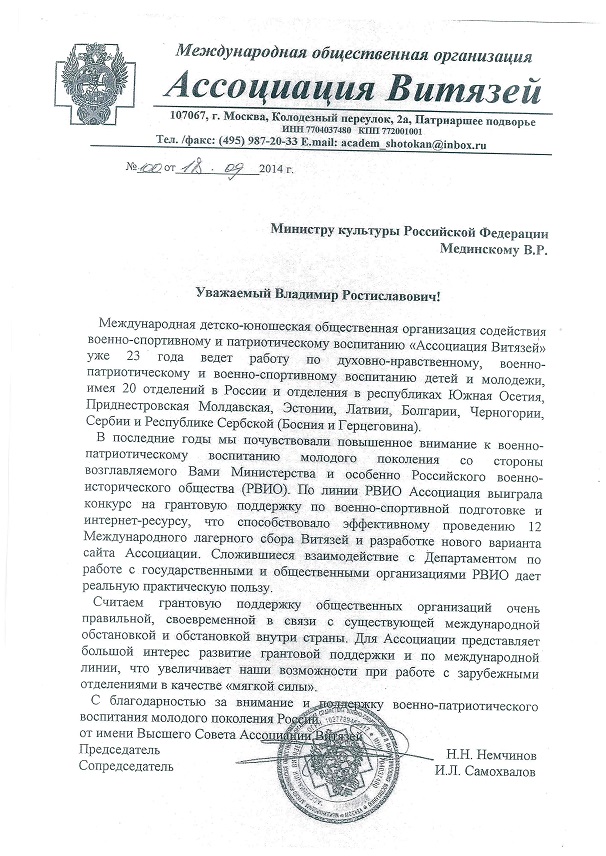 «В последние годы мы почувствовали повышенное внимание к военно-патриотическому воспитанию молодого поколения со стороны возглавляемого Вами Министерства и особенно Российского военно-исторического общества, - говорится в письме, адресованном председателю РВИО Владимиру Мединскому от руководителей Международной детско-юношеской общественной организации содействия военно-спортивному и патриотическому воспитанию «Ассоциация Витязей». - Существуя уже 23 года и имея 20 отделений в России и филиалы в республиках Южная Осетия, Приднестровская Молдавская, Эстонии, Латвии, Болгарии, Черногории, Сербии, Республике Сербской – «Ассоциация Витязей» выиграла конкурс РВИО и получила грант на поддержку интернет-ресурса и военно-спортивной подготовки, что позволило на должном уровне провести 12 Международный лагерный сбор Витязей и разработать новый сайт Ассоциации».