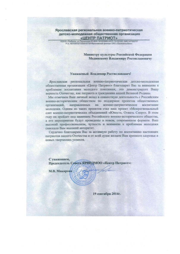 «Мы благодарны за Ваш личный вклад в дело поддержки проектов, направленных на военно-патриотическое воспитание молодежи, - сказано в письме ярославской региональной военно-патриотической детско-молодежной общественной организации «Центр Патриот», адресованном председателю Российского военно-исторического общества, Министру культуры РФ Владимиру Мединскому. – Одним из таких проектов стал наш «Межрегиональный слет военно-патриотических объединений «Юность. Отвага. Спорт». В этом году он пройдет под знаменем Российского военно-исторического общества, а его мероприятия будут проведены в новом современном формате. Сердечно благодарим Вас за активную работу по воспитанию патриотов нашего Отечества и от всей души желаем Вам крепкого здоровья и новых творческих успехов».