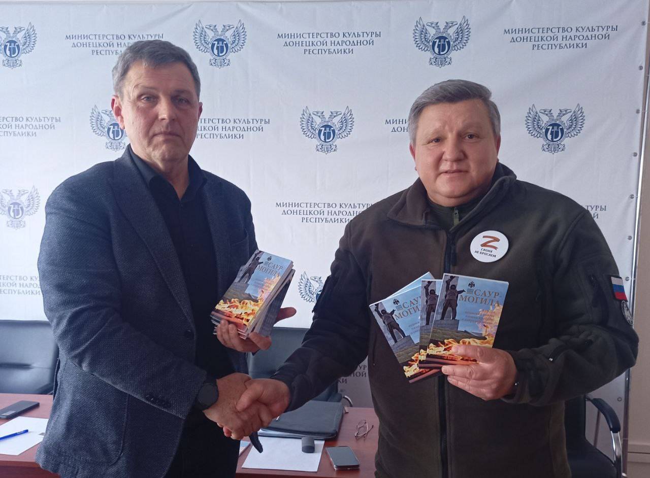 По поручению Председателя РВИО Владимира Мединского Николай Овсиенко вручил исполняющему обязанности Министра культуры Донецкой Народной Республики Михаилу Желтякову Благодарность «За личный вклад в реализацию проекта по восстановлению мемориального комплекса «Саур-Могила».