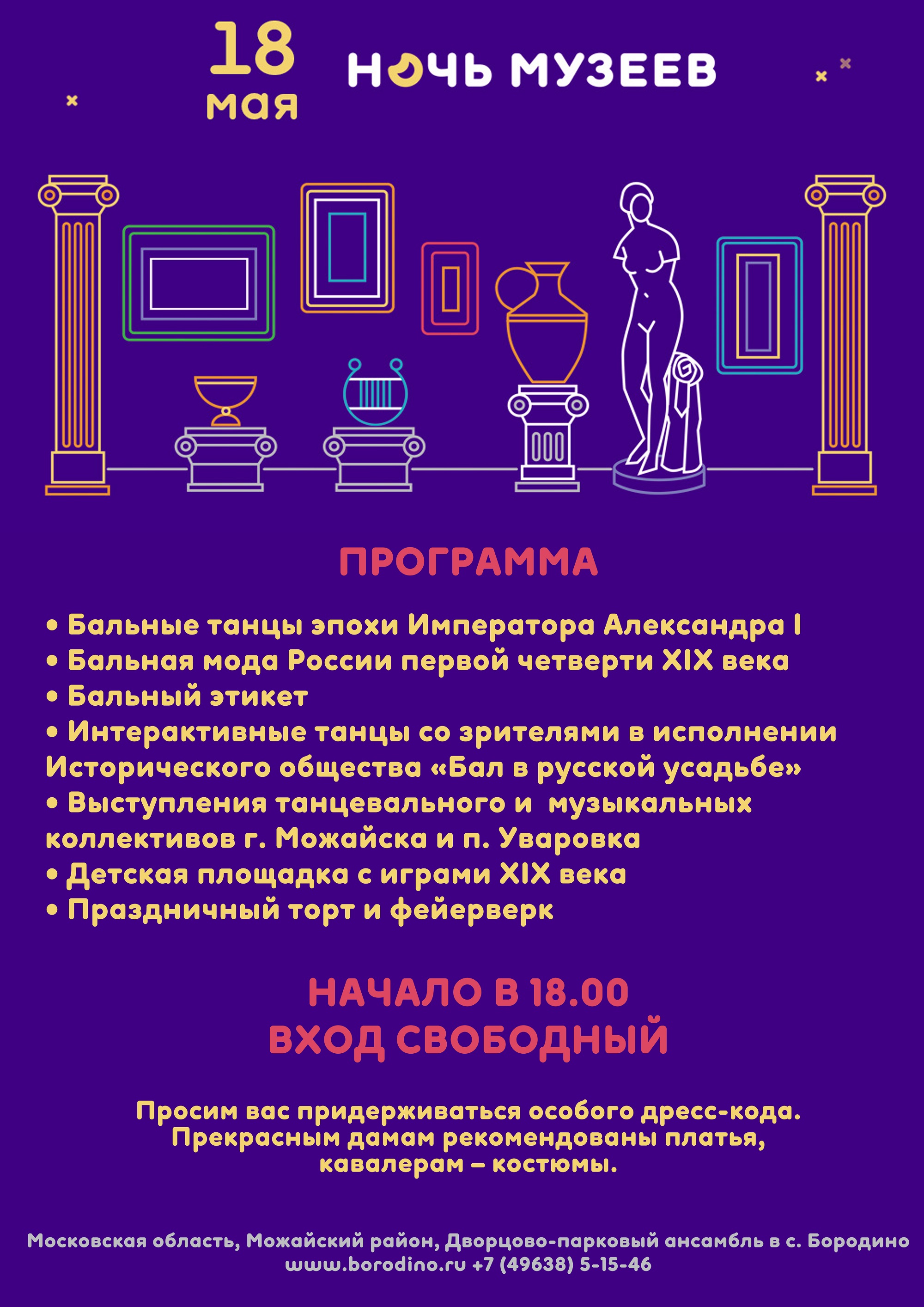 Специальную программу подготовил и партнер Российского военно-исторического общества - Бородинский музей-заповедник. Там «Ночь музеев» посвящена бальной культуре XIX века. Организаторы создадут погружение в эпоху Александра I через интерактивные программы, в которых будут представлены танцы, мода и этикет балов. Посетители также смогут поддержать атмосферу соблюдая особый дресс-код: прекрасным дамам рекомендованы платья, а кавалерам – костюмы. Завершится программа праздничным фейерверком.