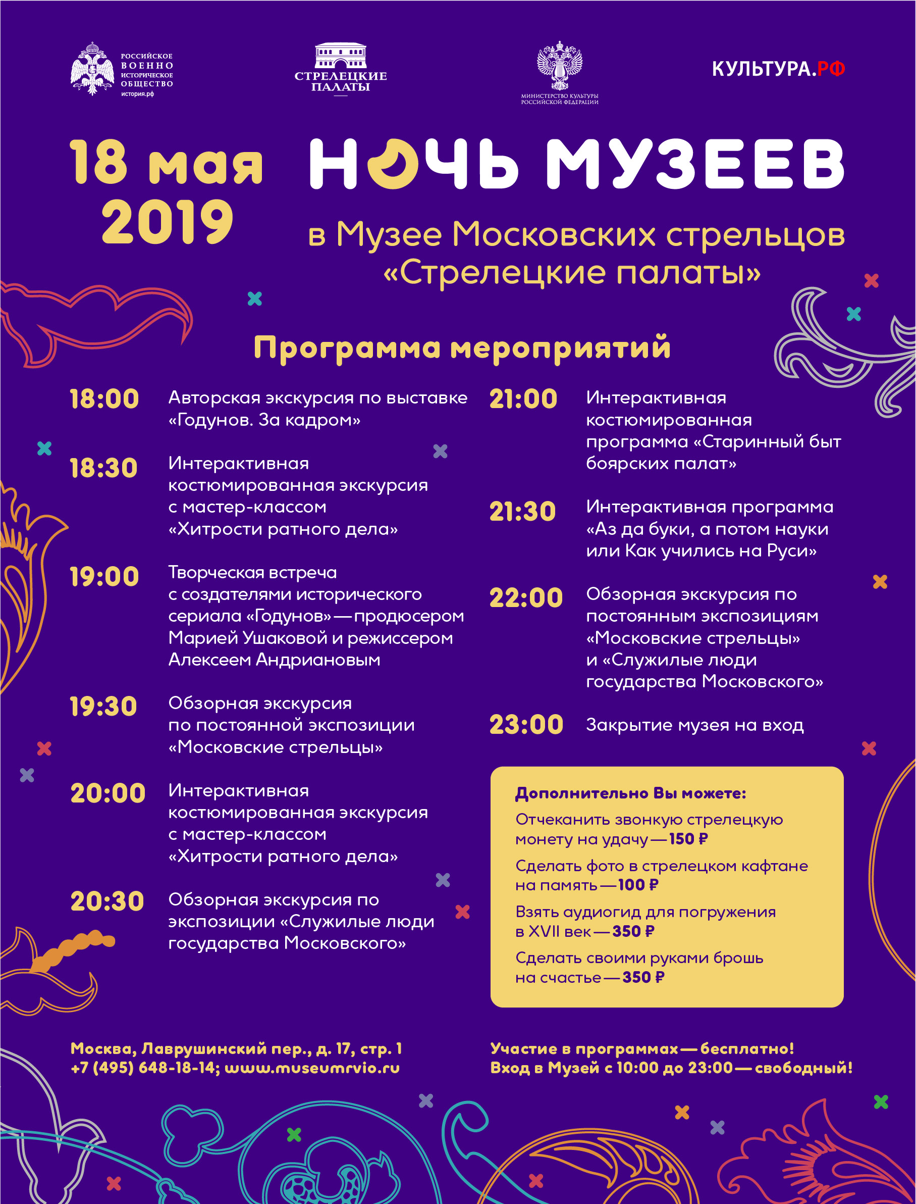 22:00 — Обзорная экскурсия по постоянным экспозициям «Московские стрельцы» и «Служилые люди государства Московского»;