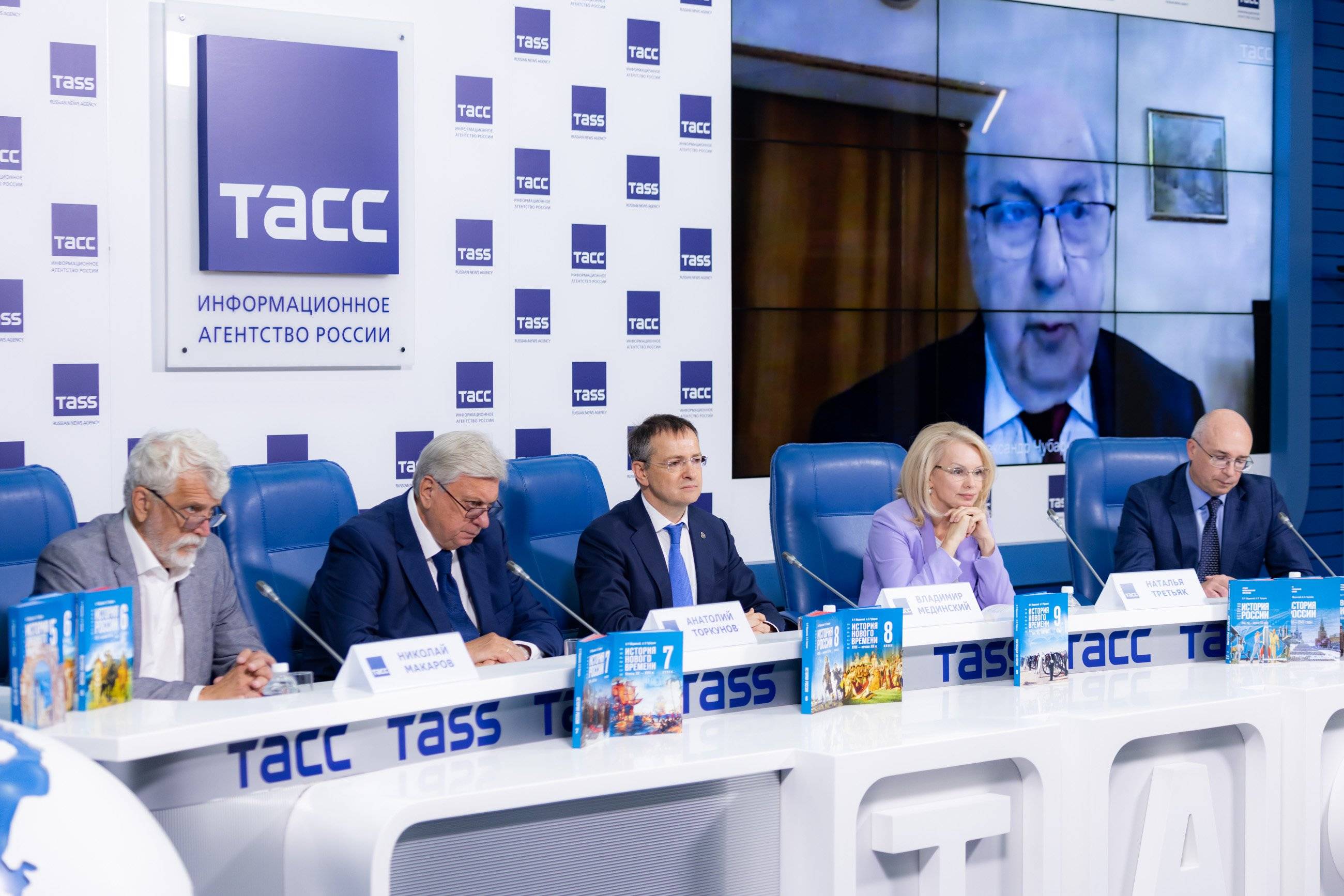 Авторами учебника по истории для 5-9-х классов выступили помощник Президента Российской Федерации, Председатель Российского военно-исторического общества Владимир Мединский, ректор МГИМО Анатолий Торкунов, научный руководитель Института всеобщей истории РАН Александр Чубарьян.