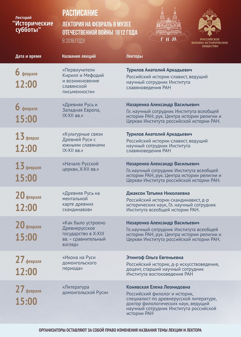 Государственный исторический музей, Российское военно-историческое общество при поддержке Министерства культуры Российской Федерации представляют новый проект - лекторий «Исторические субботы», посвященный как известным, так и малоизученным страницам прошлого России.