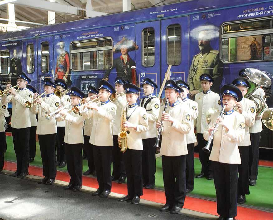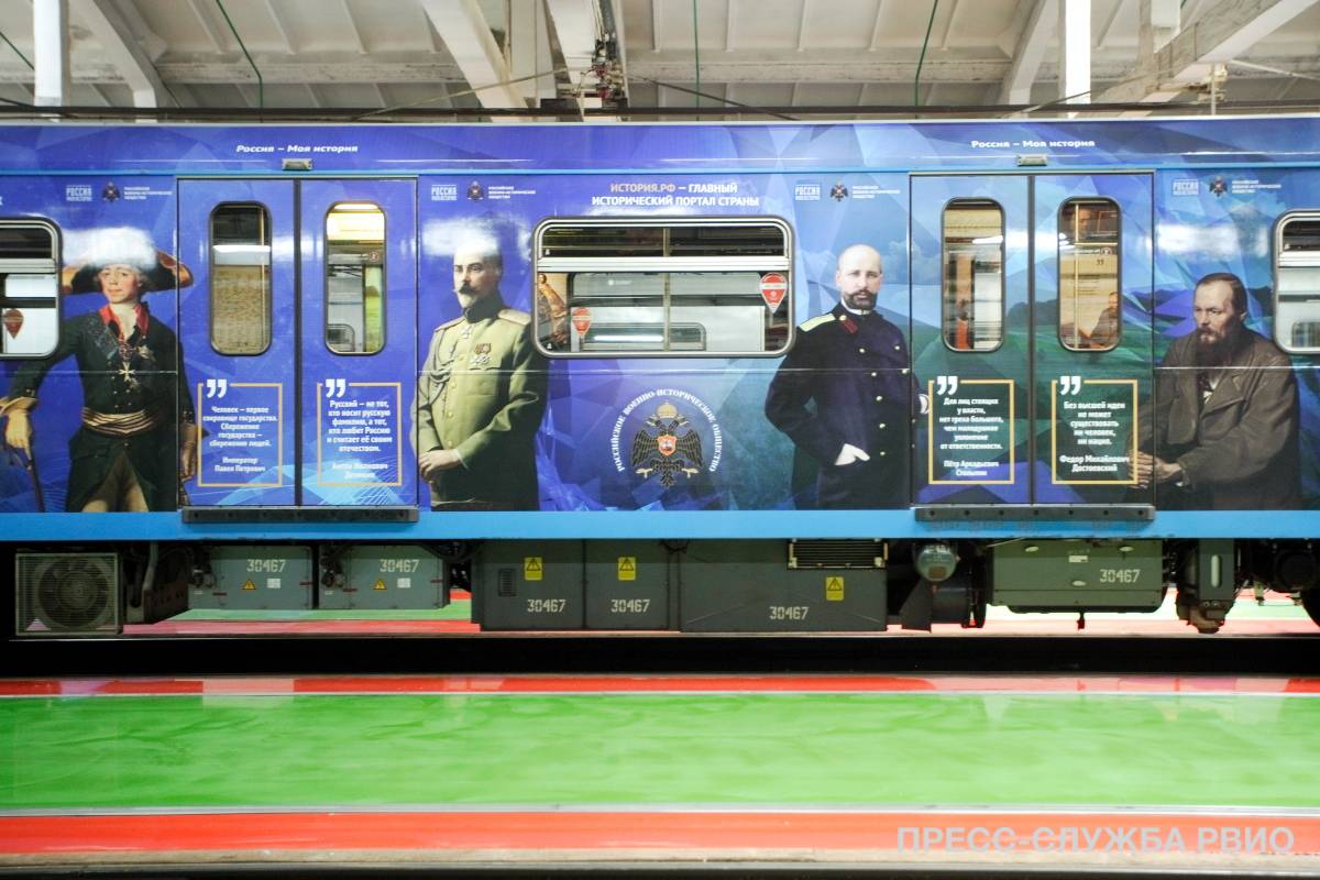 Метропоезд «Россия – моя история» – это результат совместной работы Российского военно-исторического общества, Министерства культуры РФ, Департамента транспорта города Москвы, Московского метрополитена и Фонда гуманитарных проектов «Моя история».
