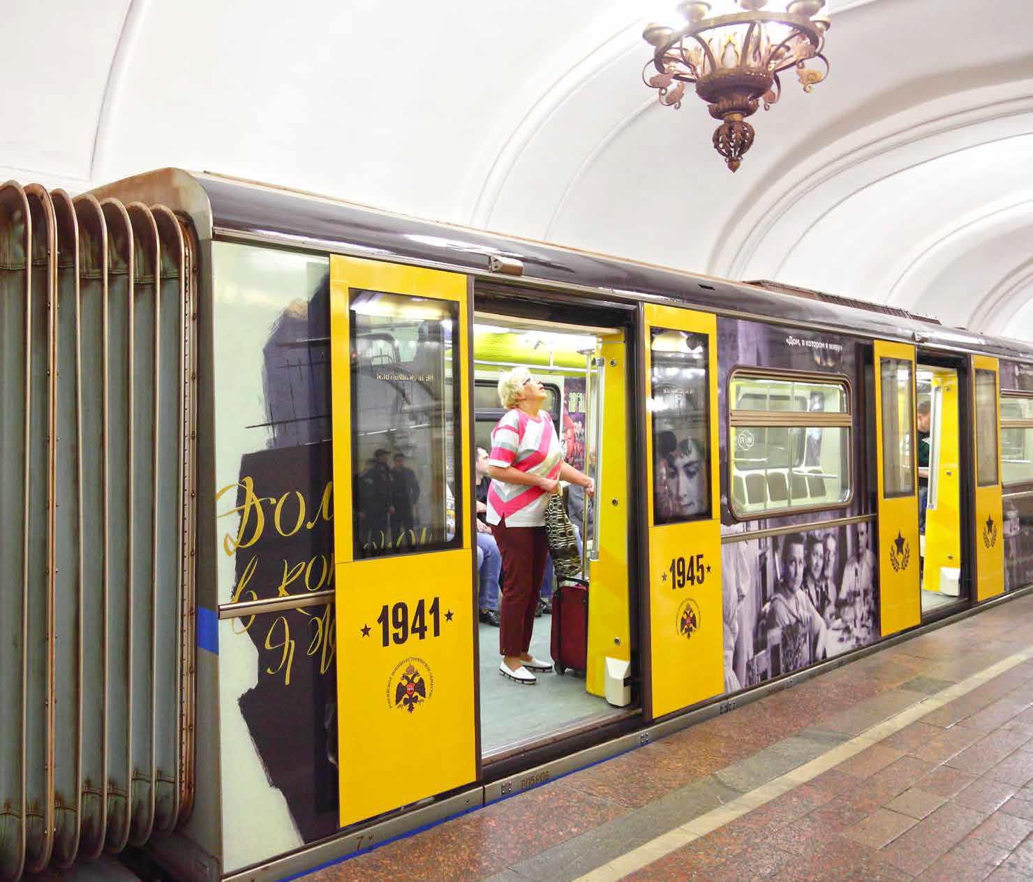 В трех ярко-желтых поездах "Кино Победы", которые перевозят пассажиров на Кольцевой, Арбатско-Покровской и Филёвской линиях, представлены кадры и афиши из фильмов о Великой Отечественной войне, интересная информация о кинолентах. Каждый вагон поезда «Легенды Кино» посвящен кинолентам известных российских режиссеров (Никиты Михалкова, Станислава Говорухина, Карена Шахназарова и др.) и фильмам-призерам Московского международного кинофестиваля. Еще один вагон напоминает об одной из самых значимых документальных отечественных лент - «Разгром немецких войск под Москвой». Фотокадры дополняют исторические справки о реальных событиях, происходивших в нашей стране в период, о котором рассказывается в фильмах.