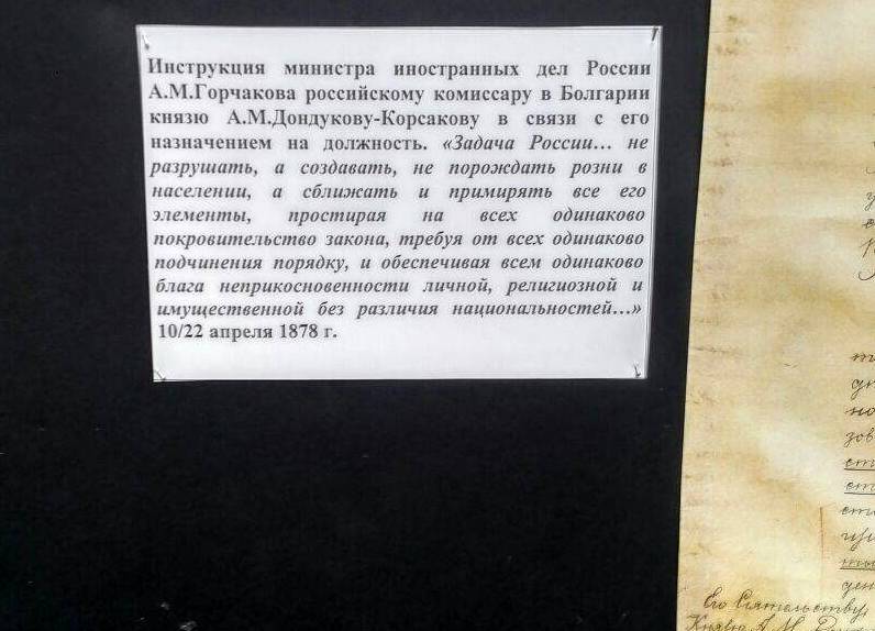 - Выставка, безусловно, удалась. Уникальные документы и потрясающие по своей исторической и художественной ценности фотографии, повествующие о событиях почти полуторавековой давности, помогают погрузиться в атмосферу того времени, лучше понять ход событий, оценить вклад России не только в освобождение болгарского народа от османского ига, но и в обустройство молодого государства в первые послевоенные годы, - рассказала руководитель Департамента информационной политики РВИО Надежда Усманова.