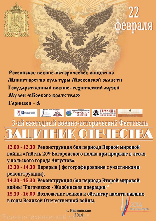 22 февраля несколько тысяч человек стали гостями III ежегодного военно-исторического фестиваля «Защитник Отечества». Мероприятие прошло в Черноголовке Ногинского района Московской области при активном участии и поддержке Российского военно-исторического общества. За несколько часов зрители смогли увидеть восстановление эпизодов боя Первой мировой войны (Гибель 209 Богородского полка в Восточной Пруссии в 1915 году) и Великой Отечественной войны (Рогачевско-Жлобинская операция 1944 года).