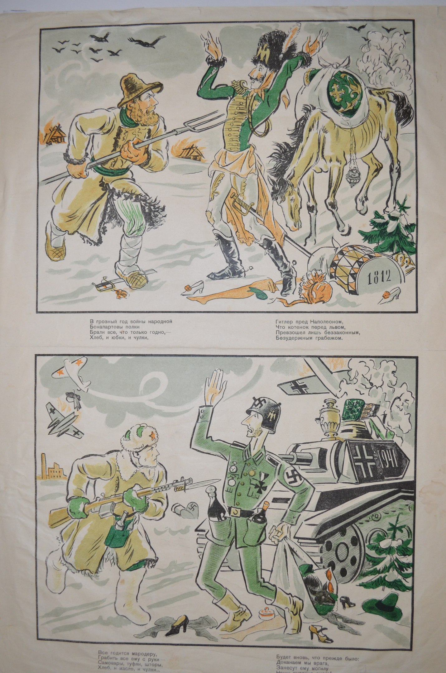 В экспозиции представлены подборки из фондов Государственного Бородинского военно-исторического музея-заповедника: плакаты времен Великой Отечественной войны, русская карикатура эпохи 1812 года, а также фотографии, агитационные листовки, книги, личные вещи участников боев на Бородинском поле.