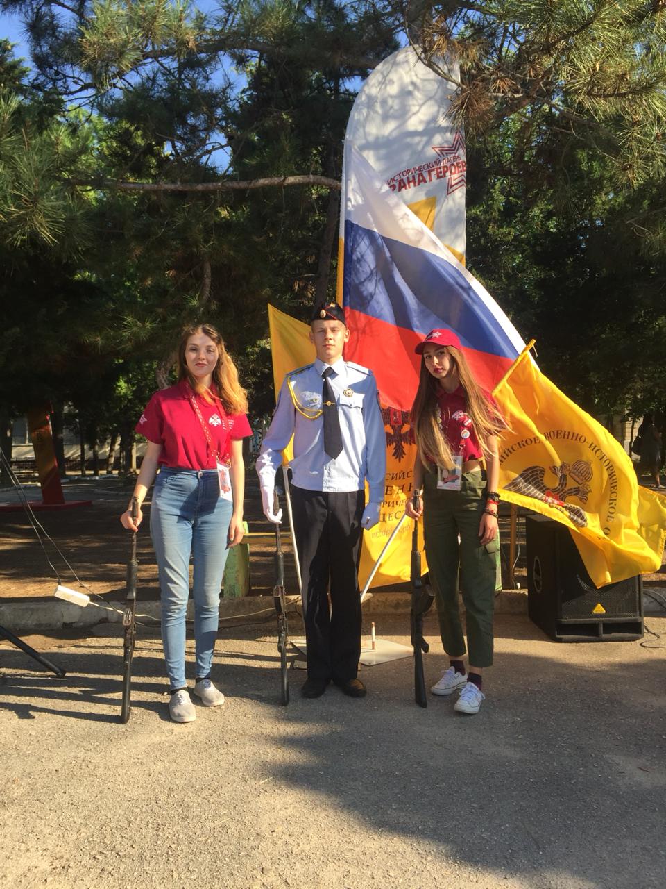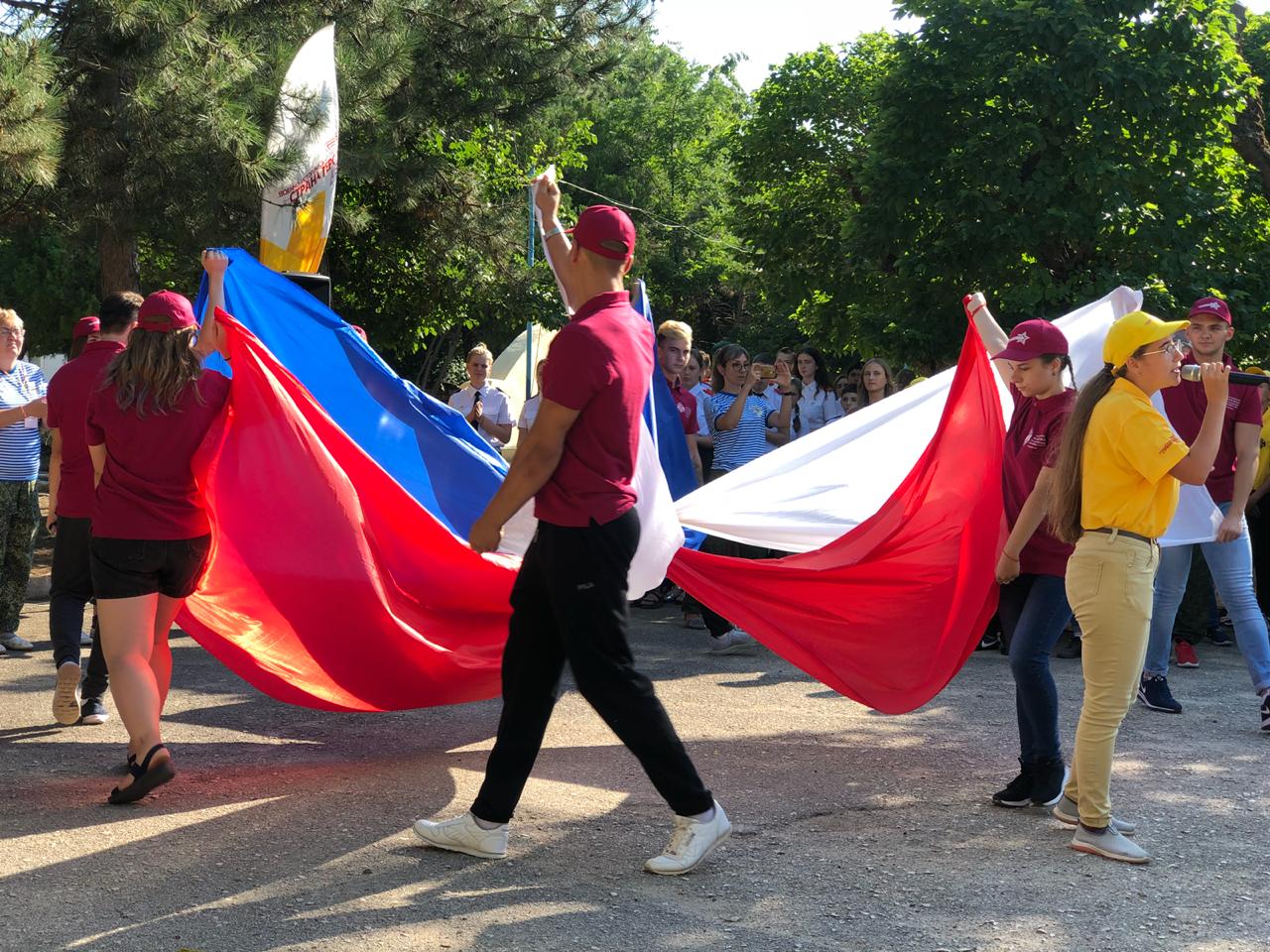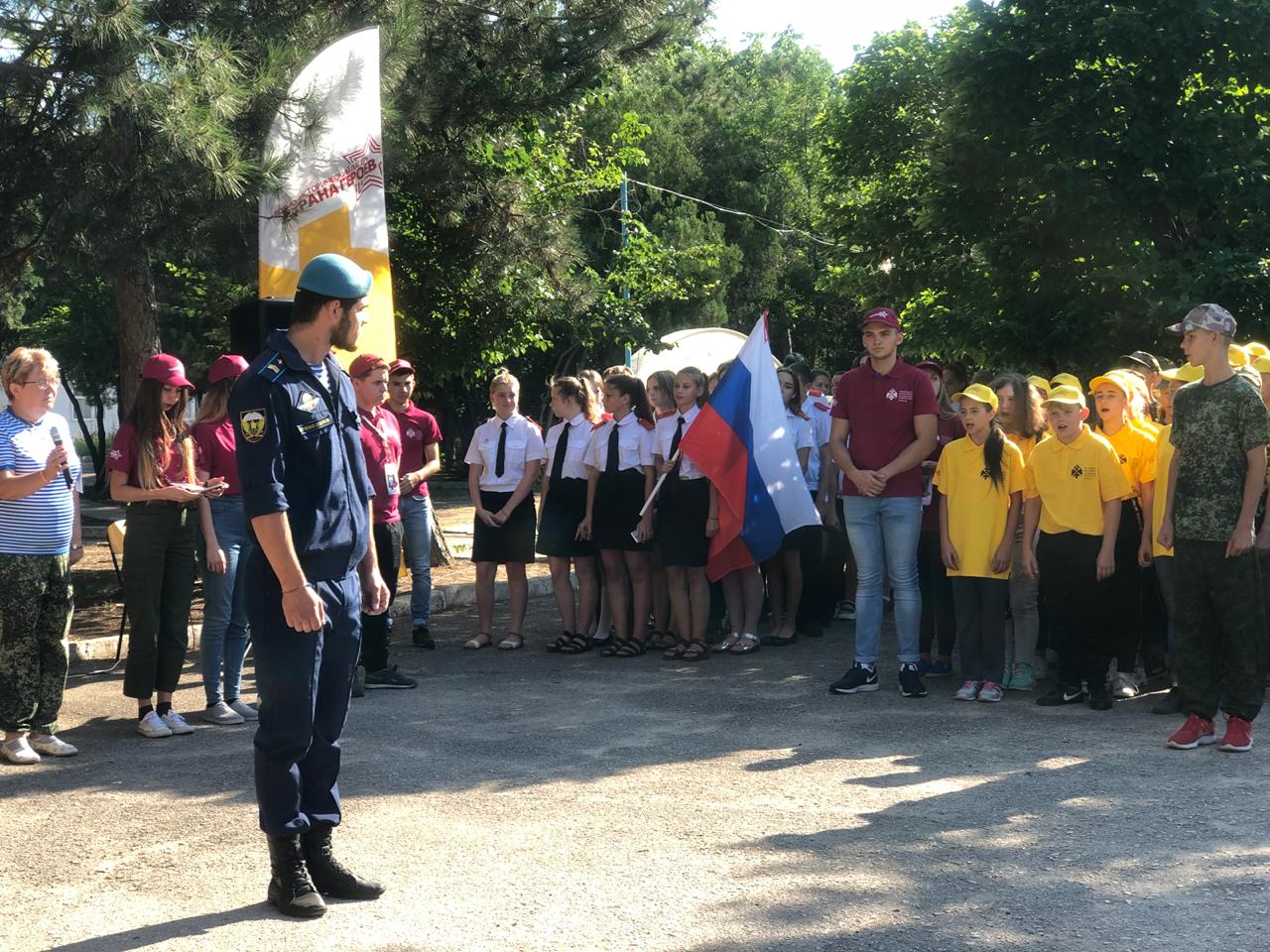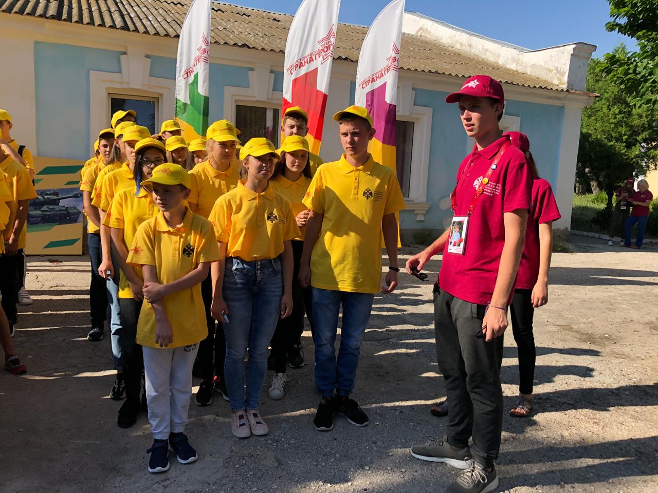 Прибытие ребят было отмечено торжественными мероприятиями с поднятием флага и посвящением в участников «Страны Героев» — всем школьниками вручили специальные памятные знаки.