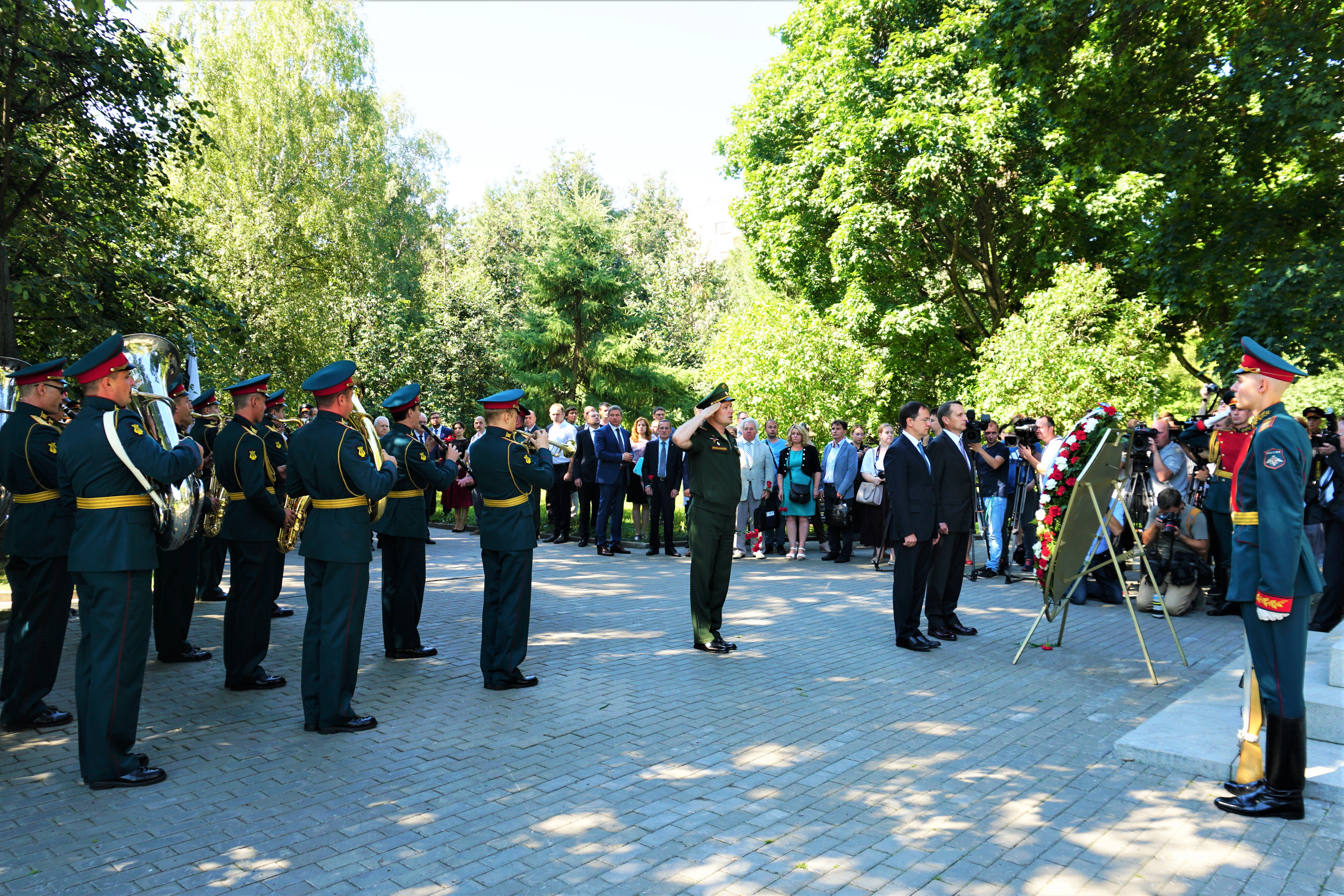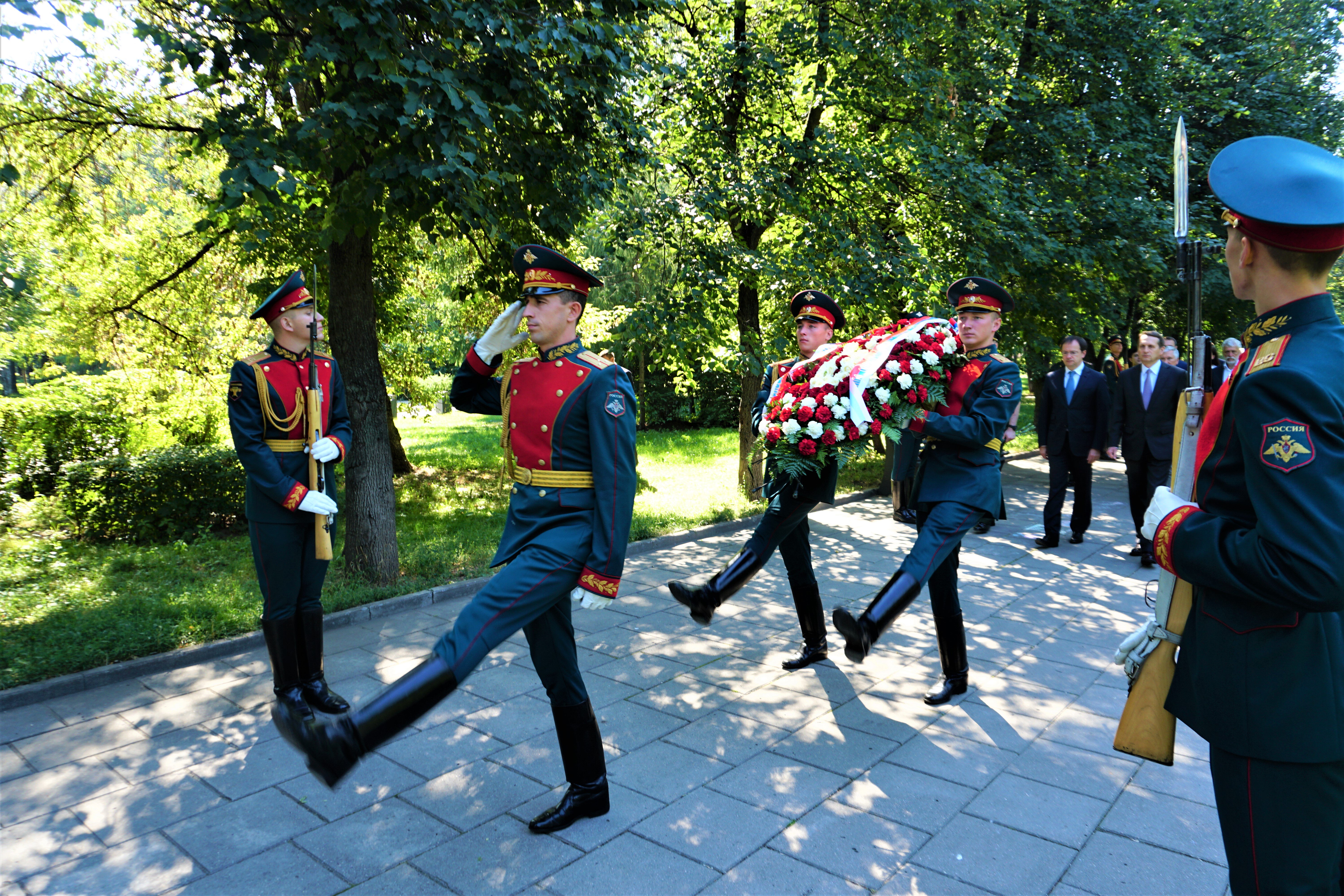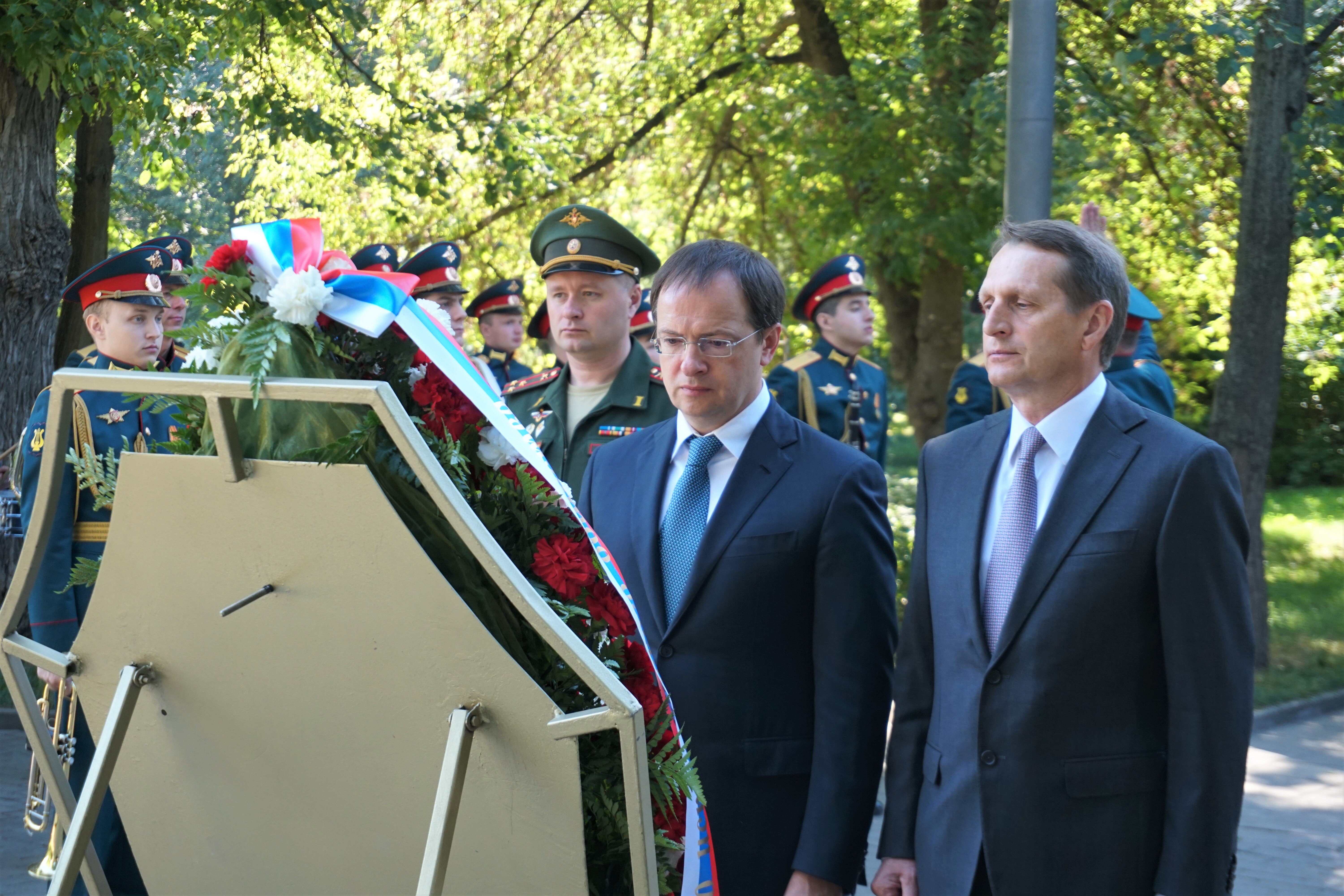 Сегодня утром в Мемориально-парковом комплексе Героев Первой мировой войны Председатель Российского исторического общества Сергей Нарышкин и Министр культуры РФ, Председатель РВИО Владимир Мединский возложили цветы к обелиску «Павшим в Мировой войне 1914–1918 годов» и могиле Верховного Главнокомандующего всеми сухопутными и морскими силами Российской Империи Великого князя Николая Николаевича (младшего), чьи останки покоятся в часовне Спаса Преображения на Братском воинском кладбище.