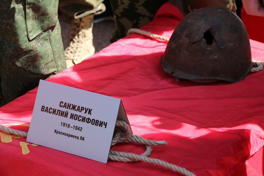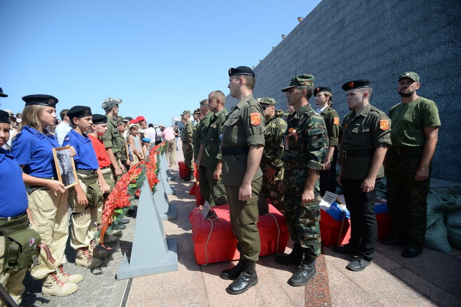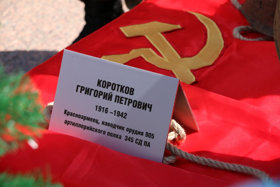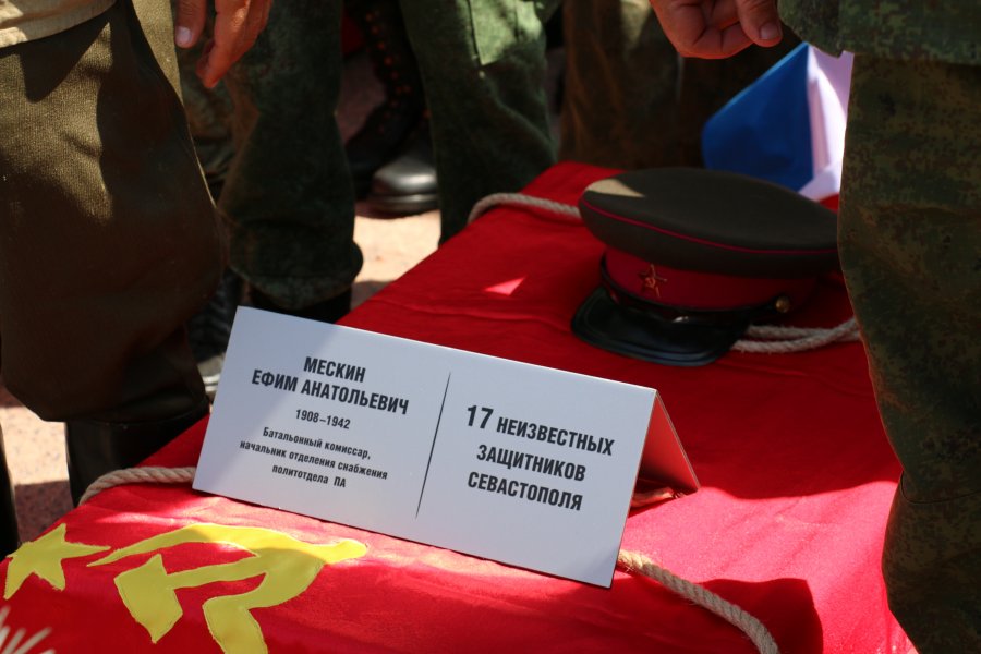 Поисковикам удалось установить имена трех защитников города, чьи останки были преданы земле в этот день: батальонного комиссара Ефима Мескина, красноармейцев Василия Санжарука и Григория Короткова. Все бойцы погибли в 1942 году. На траурную церемонию были приглашены родственники этих воинов. Сыну Григория Короткова переданы его личные вещи, найденные рядом с останками бойца: бритва, ложка, звезда с головного убора и заполненный «смертный медальон». Всего возле некрополя 35-й береговой батареи преданы земле останки 531 защитника и освободителя города.